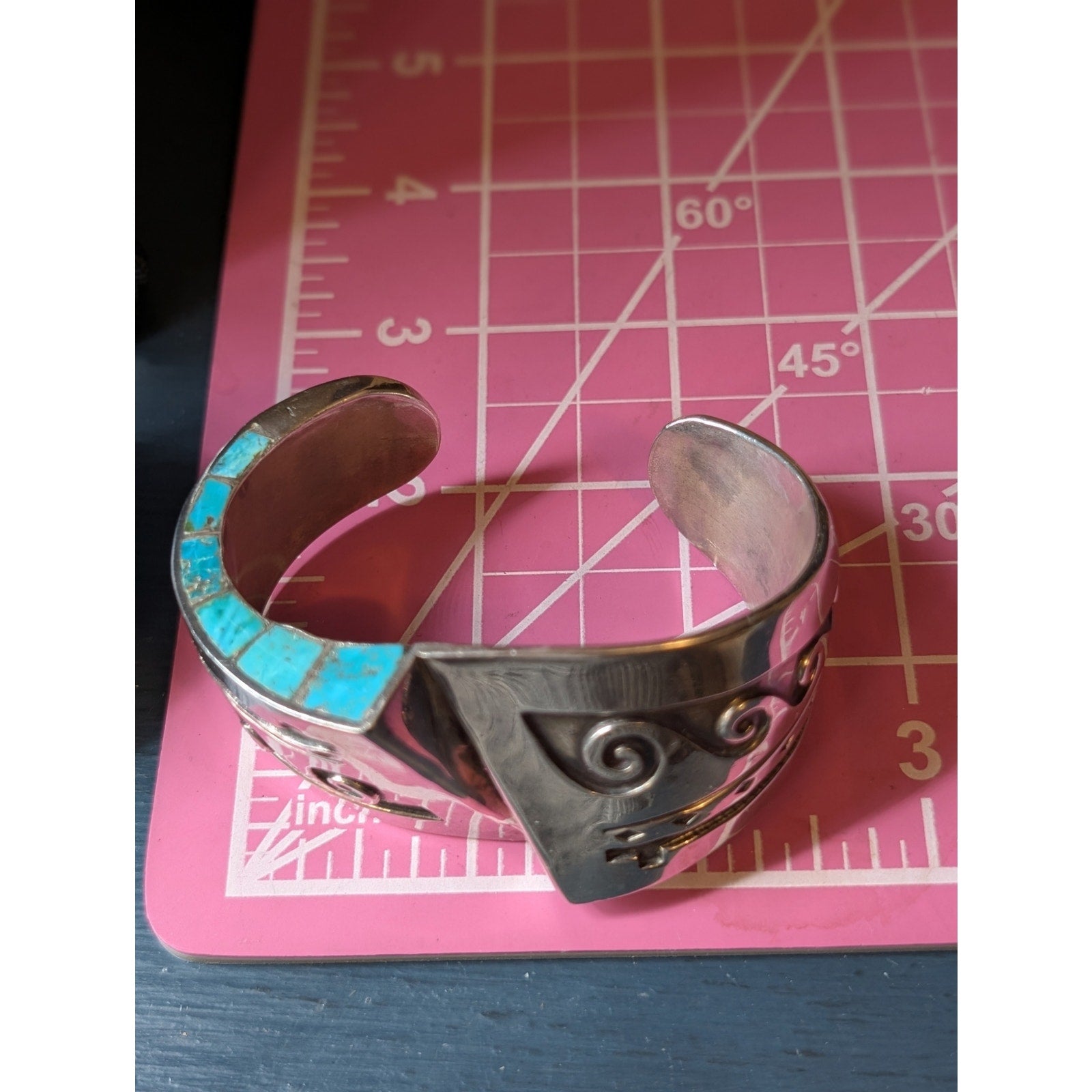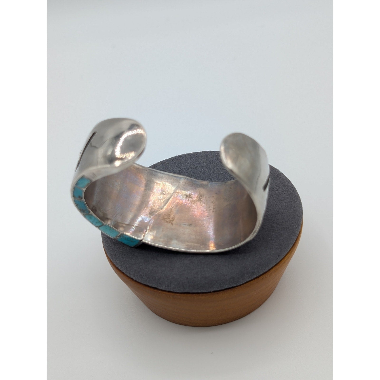 Estate VTG Native American Navajo Top Bottom Side Inlay Turquoise Sterling Cuff