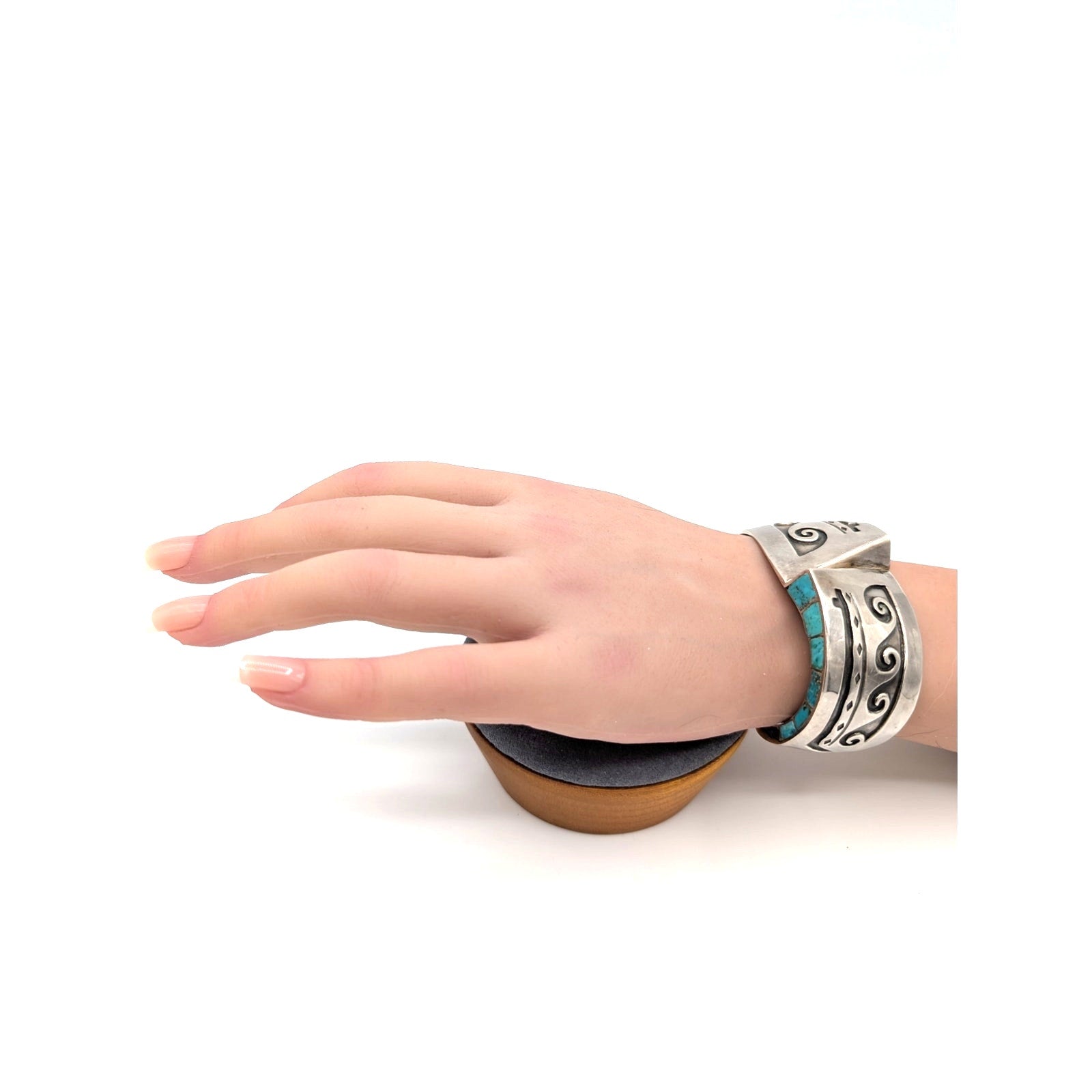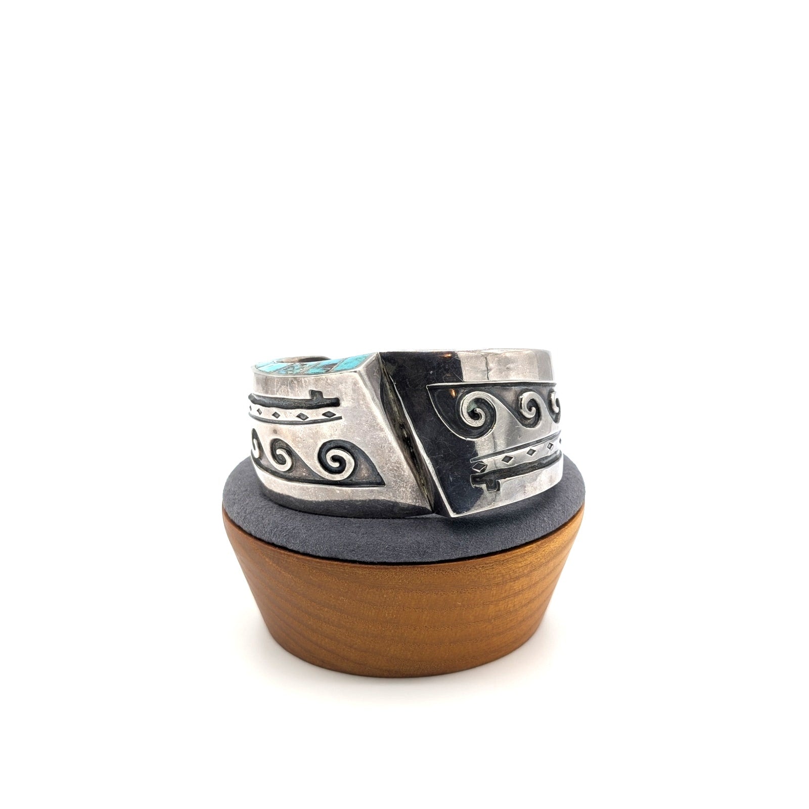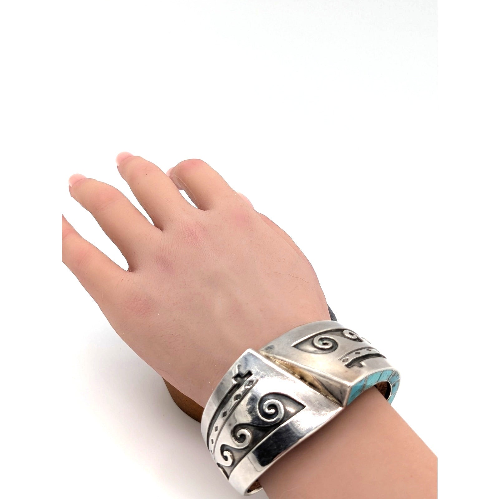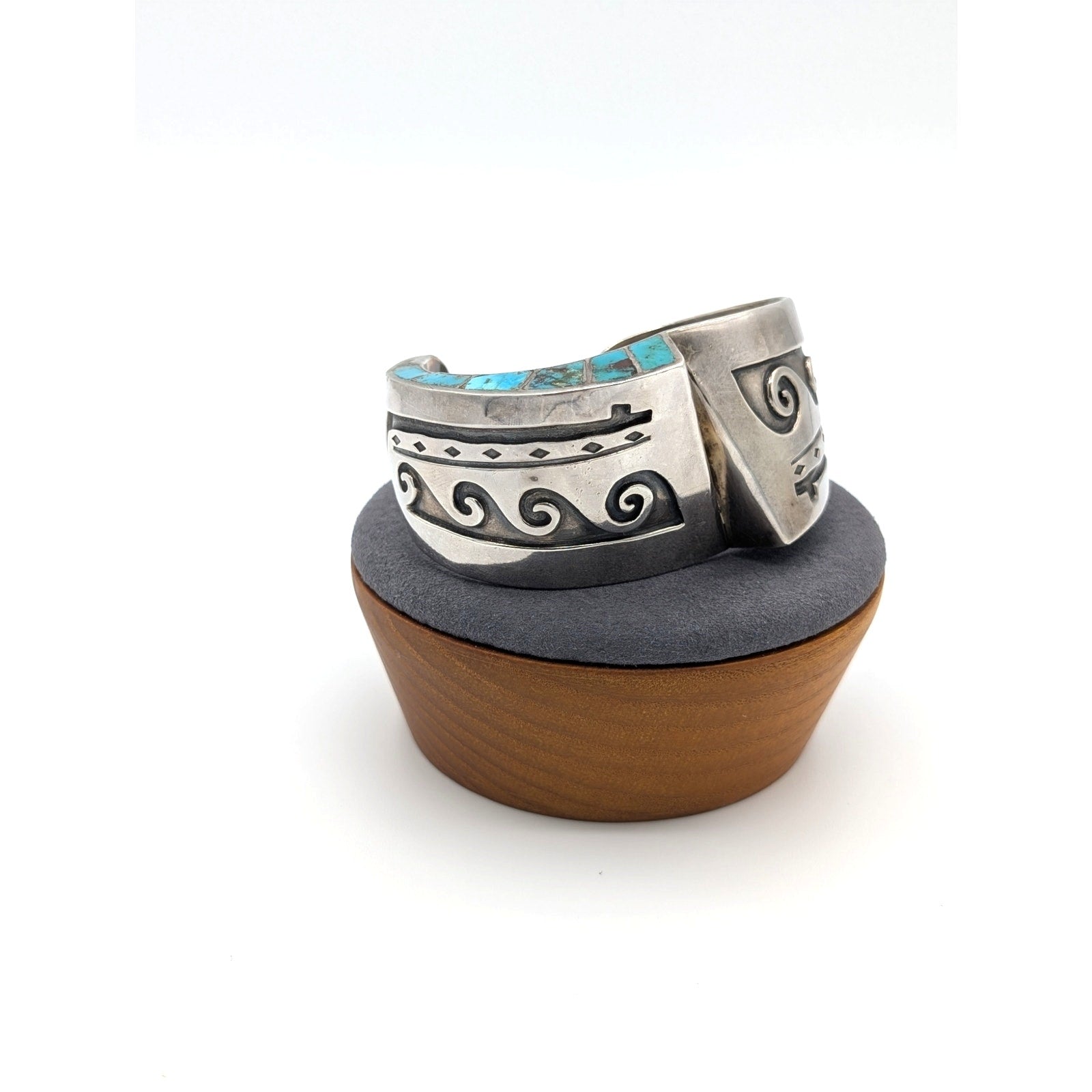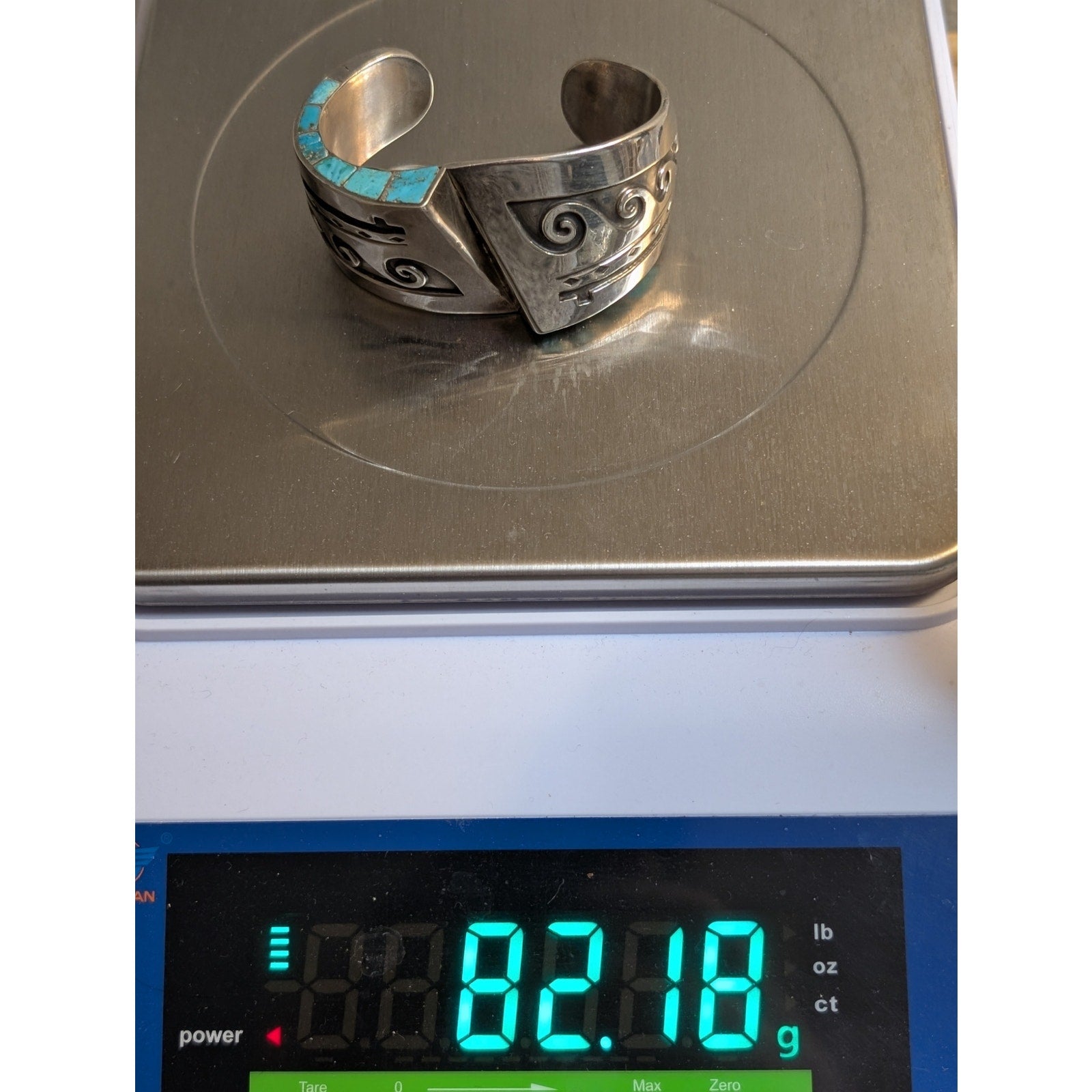 Estate Piece VTG Native American Navajo Unsigned Top Bottom Side Inlay Turquoise Cuff Sterling Bracelet 82.18g. This vintage Navajo inlaid thick silver cuff is a fascinating bracelet and is so intricately designed. Bordering the edges of the cuff are phenomenal inlaid graduating channeled turquoise stones. Carvings in wave patterns and geometric designs. Circa mid century piece. Bracelet measures 1.5" wide and 5.5" with 1" opening inside measurement. Owner had leather inserts made because she had very small wrists. Easy to put in and take out. Pre-owned, this bracelet is in excellent condition. One online site had an identical bracelet for a few more grams listed at $4999.95.