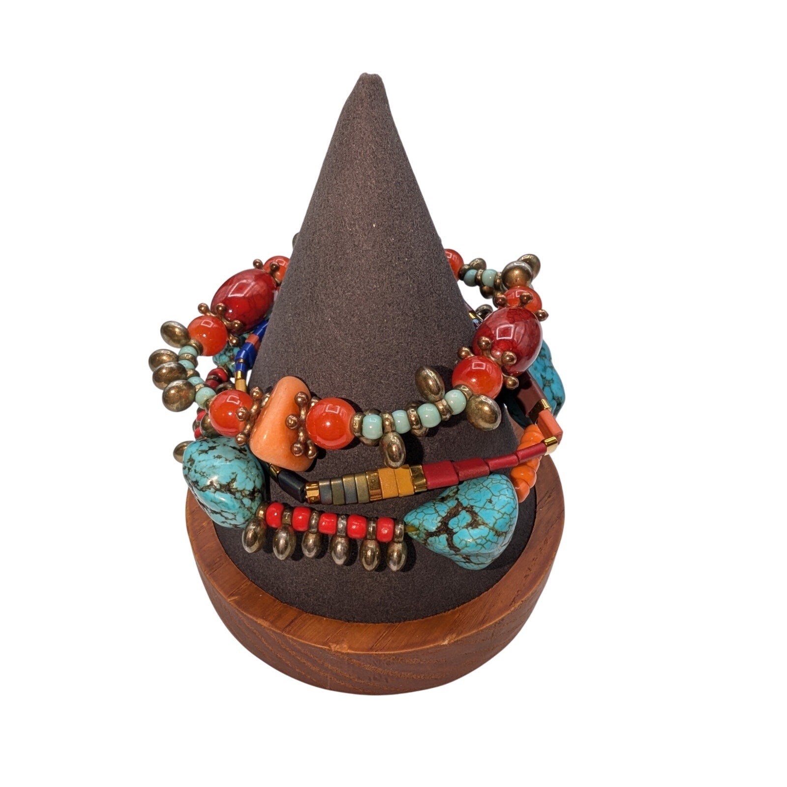 Five Strand Orange Acrylic Beaded Necklace and Three Stretch Bracelet Mixed Lot. Pre-owned, these pieces are in various conditions and being sold as is (all wearable to excellent.) The one bracelet with the turquoise look beads has less stretch than the others. Such a vibrant fun look for summer.