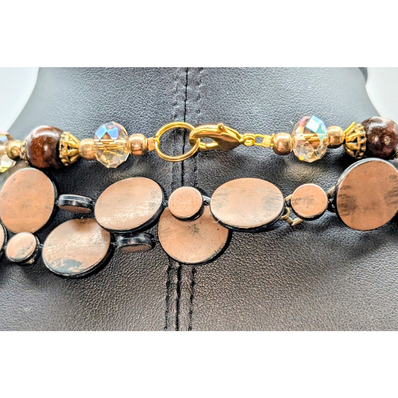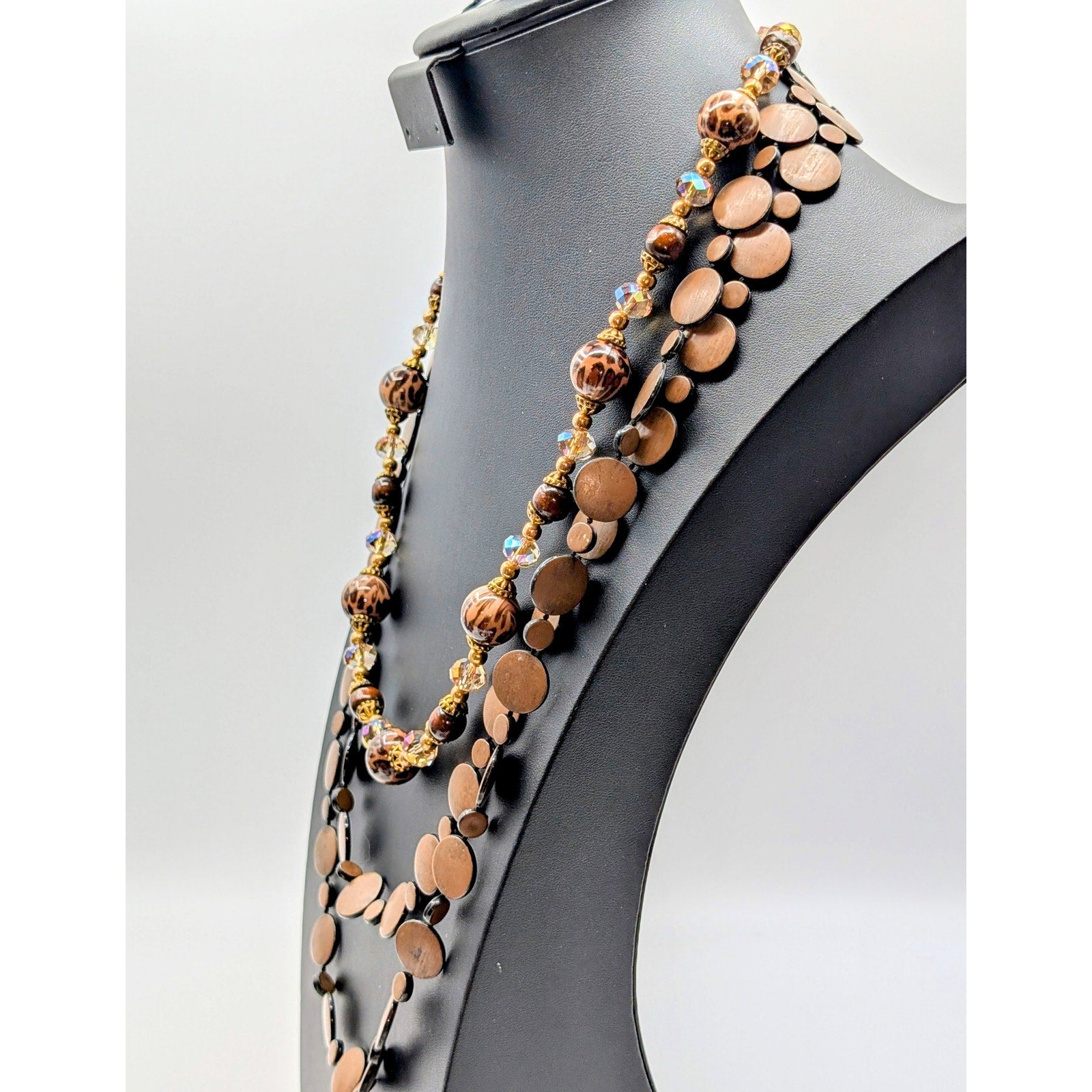 Four Piece Brown Pink Wood Crystal Animal Print Lot of 2 Necklaces & 2 Bracelets. Pre-owned, this lot of two necklaces and two bracelets is in various conditions (all wearable to excellent) and being sold as is. Vintage to modern pieces.