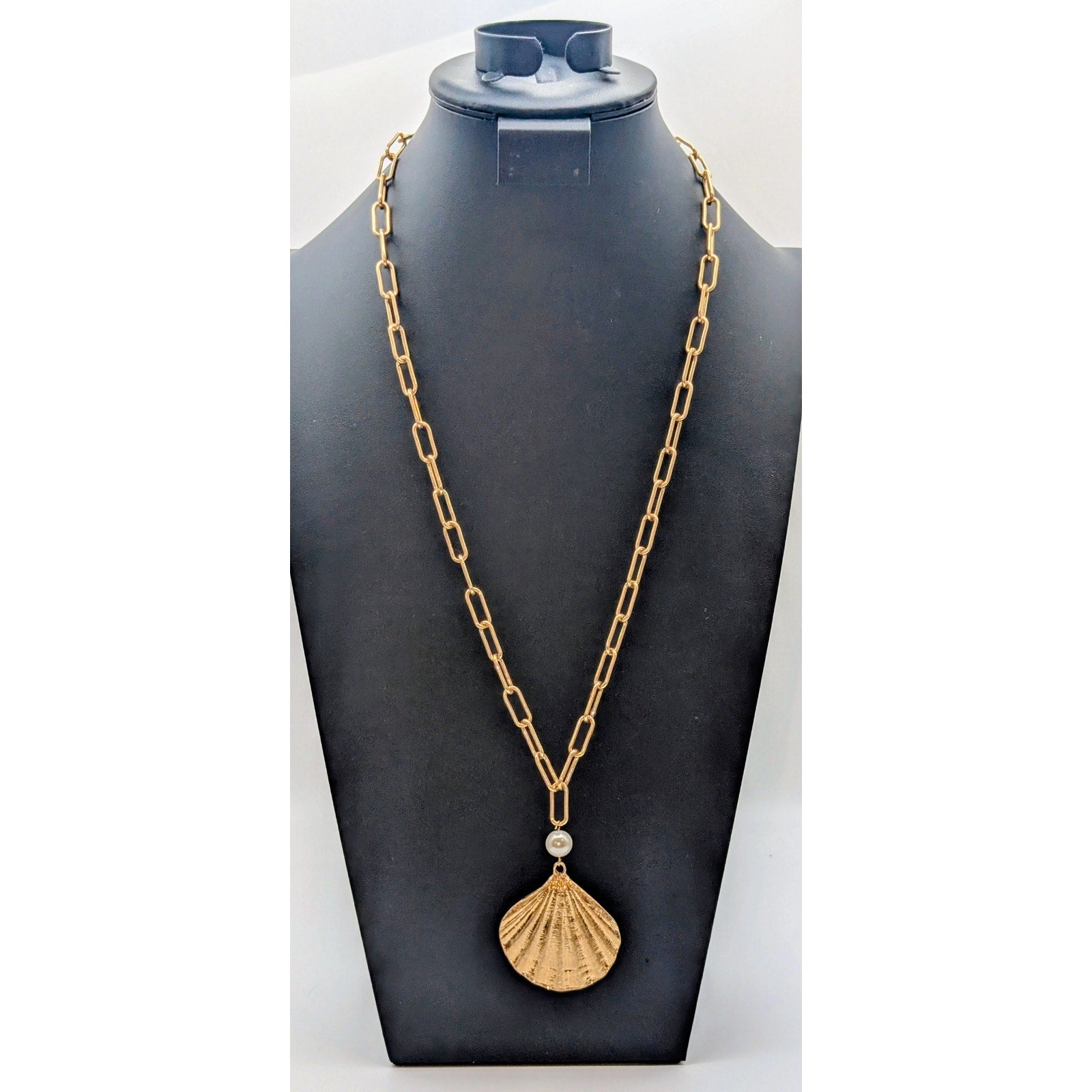 Gold Tone Clam Shell Faux Pearl Paper Clip Long Chain 28.25"-31.25" Necklace. Not a bright gold but a soft muted brushed gold look. Pre-owned, this necklace is in excellent condition and looks great layered with other pieces.