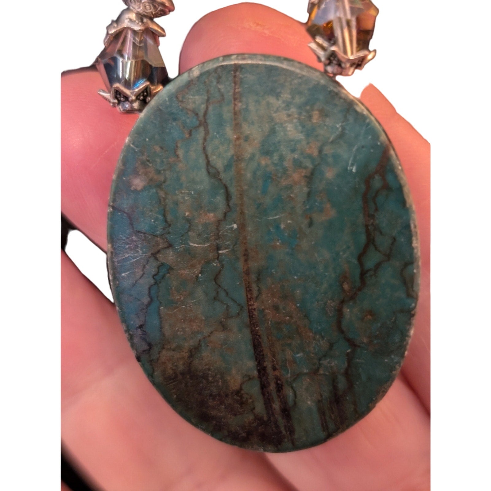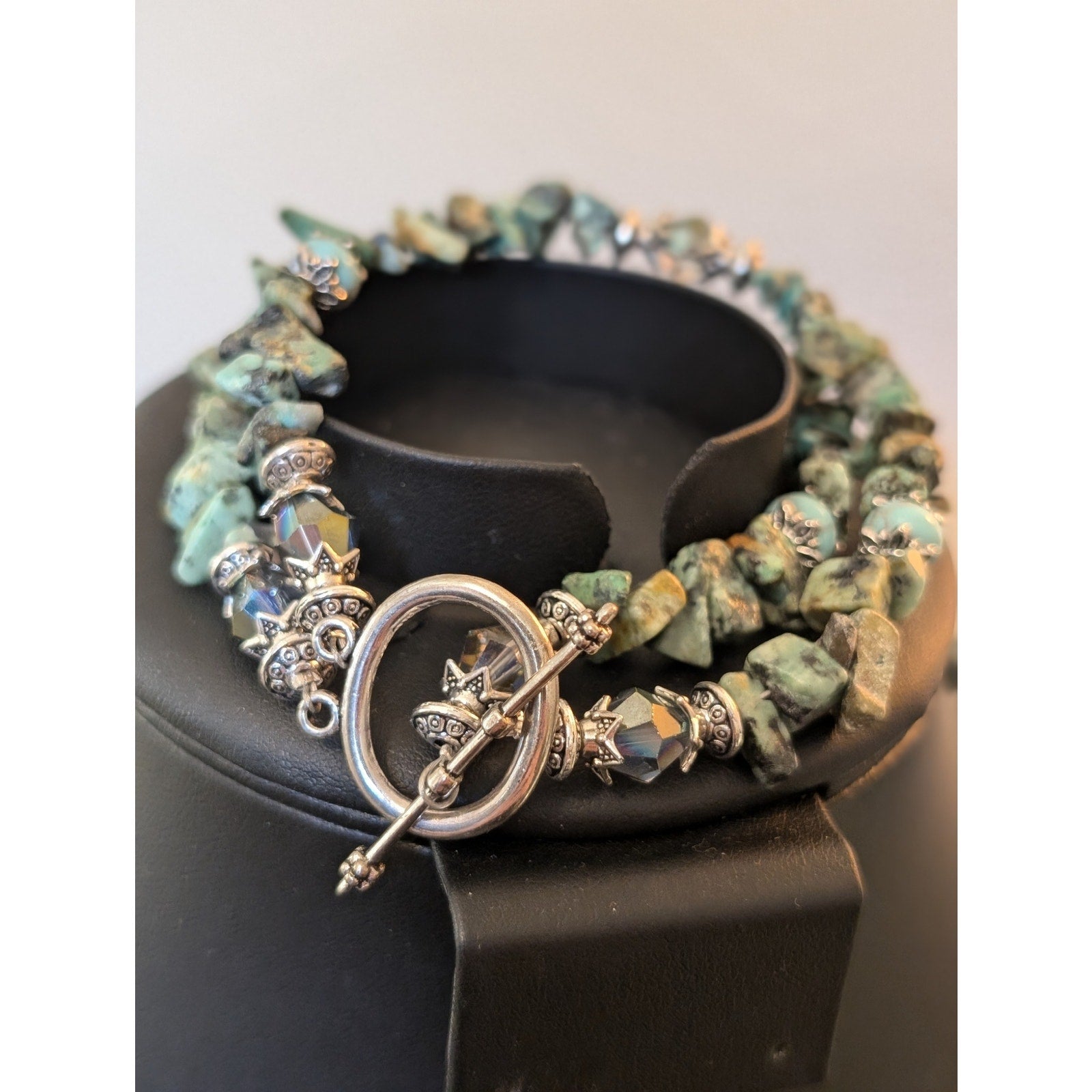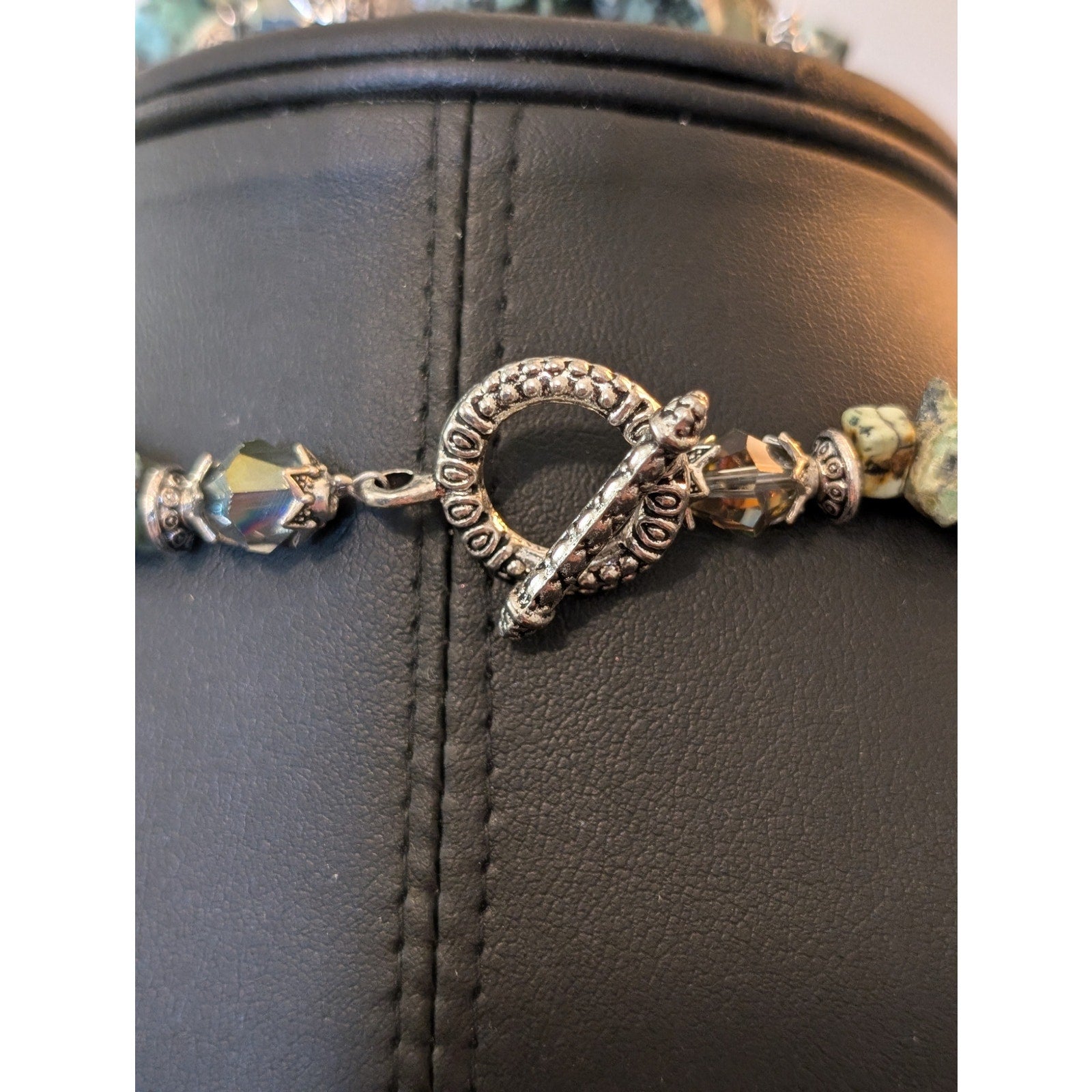 Green Stone Pendant Chip Stone Crystal Necklace & Matching 2 Strand Bracelet Set. Pre-owned, this jewelry set with toggle clasps is in excellent condition. Necklace measures 22" long.
