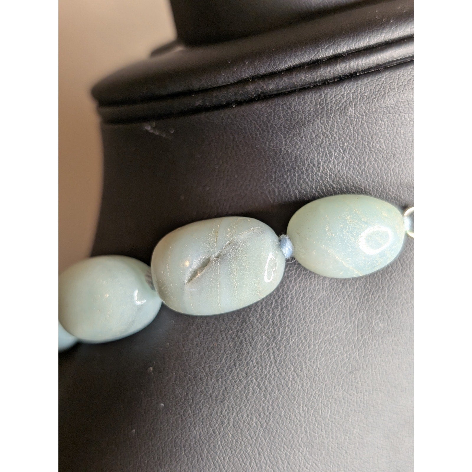 GSJ Sterling Silver Natural Blue Aqua Stone Bead Hand Knotted Necklace & Dangle Earring Set. Pre-owned, these stones, being natural have some imperfections, but it is a lovely set. Would go with so many things you would wear turquoise with. Sterling metal.