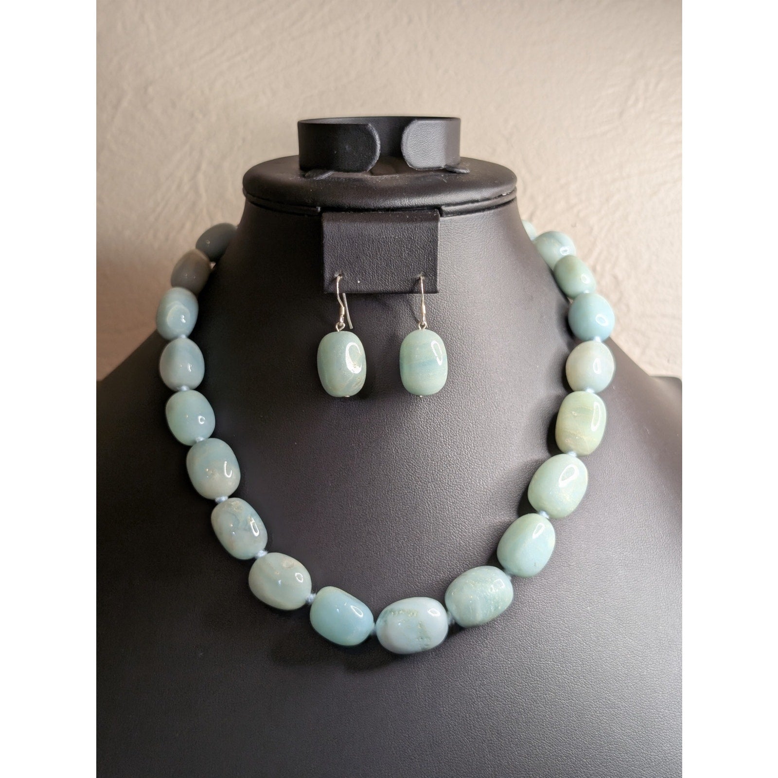 GSJ Sterling Silver Natural Blue Aqua Stone Bead Necklace & Dangle Earring Set