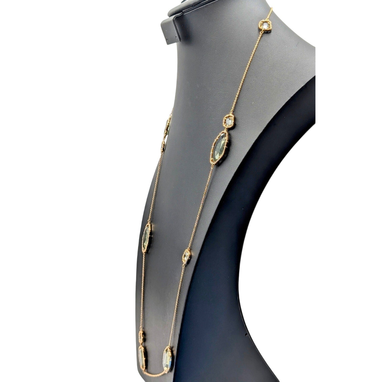 Hand-Crafted Abstract Blue Green Glass Crystal & CZ Gold Plated Long Chain Necklace. Measures approximately 34" long. Well made. Pre-owned, this necklace is in excellent condition.