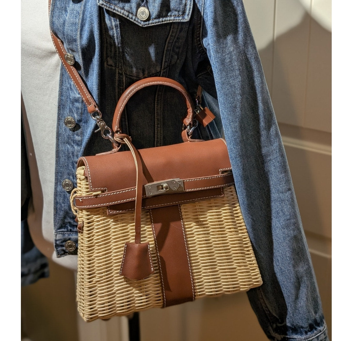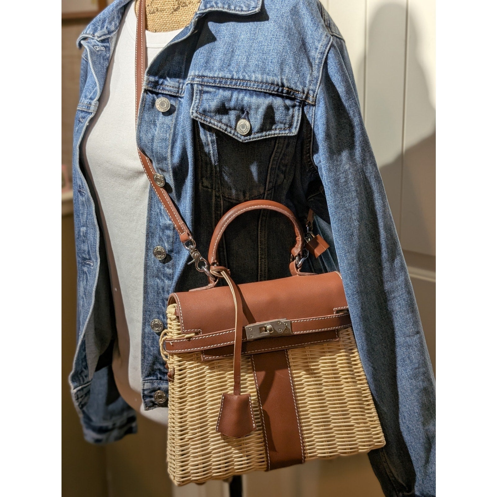 Handcrafted Rattan Genuine Leather Silver Hardware Handbag W/ Lock & Key