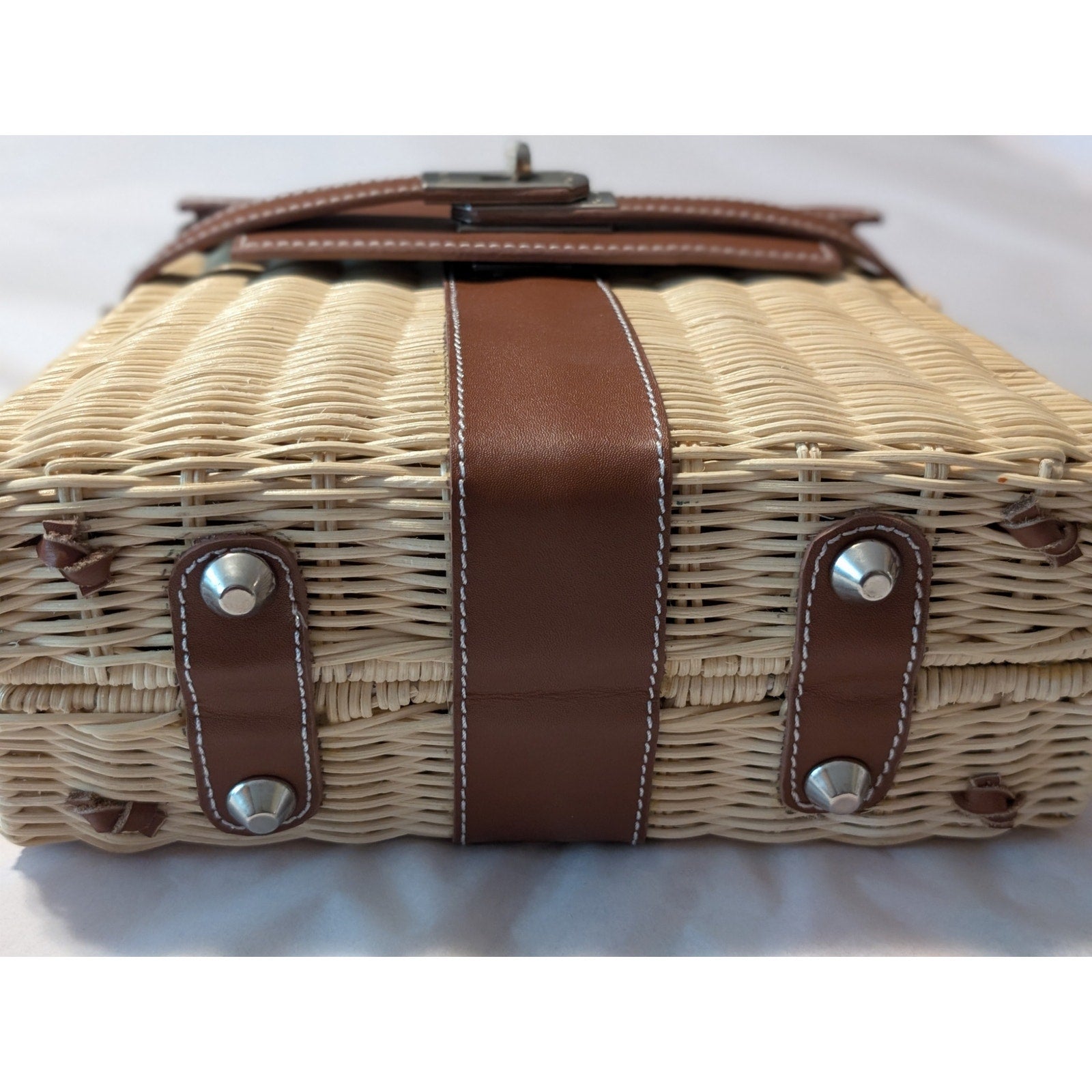 Handcrafted Rattan Genuine Leather Silver Hardware Handbag W/ Lock & Key. Pre-owned, this handbag is in excellent condition. Measures 10"L X 4.25"D x 9"H.