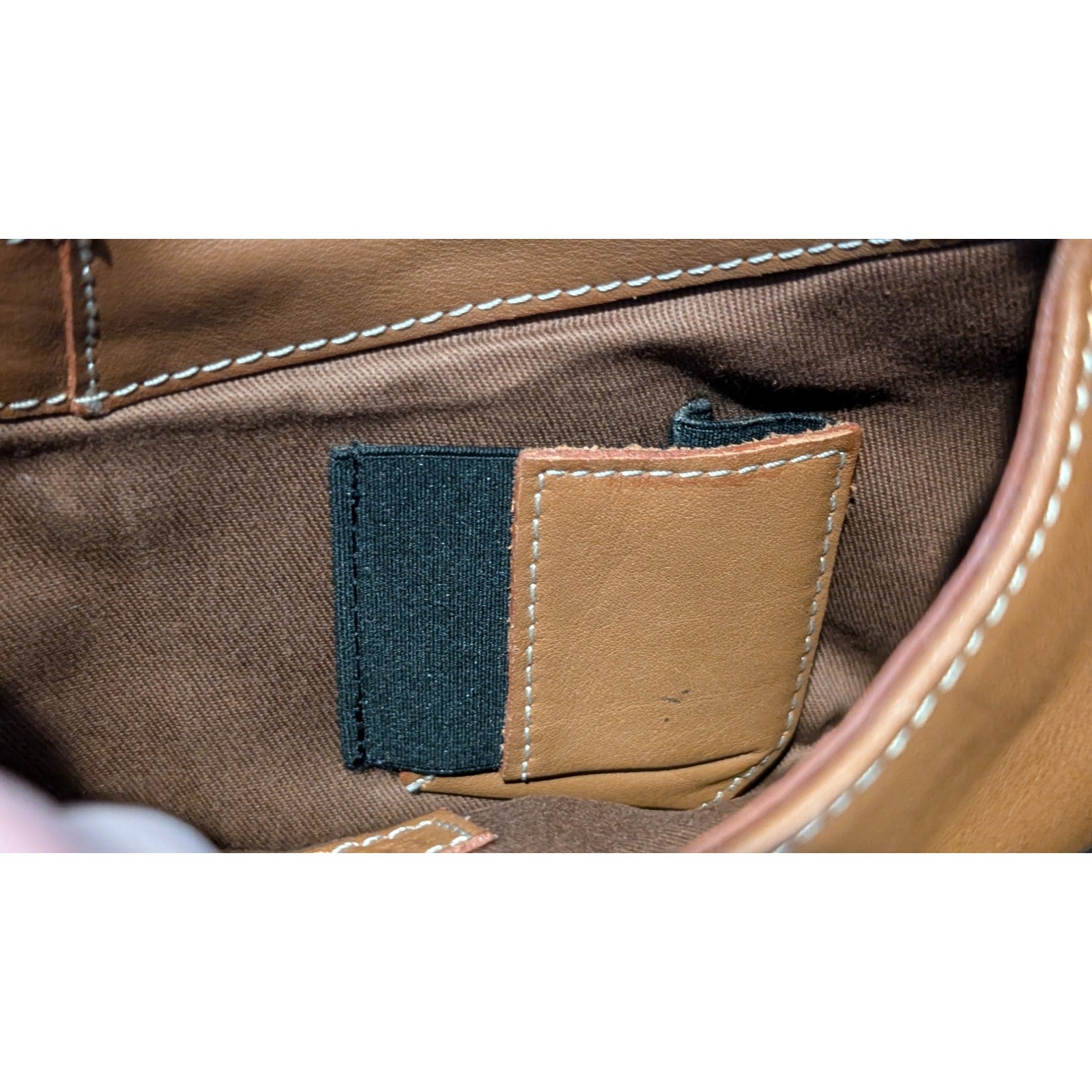 Harold's Made in Italy Genuine Soft Leather Tan Equestrian Vibe Shoulder Bag. This bag is made from a buttery soft leather. Clean inside. One zip pocket inside and an elasticized pocket for holding things. Canvas lining. Snap front. Pre-owned, this bag is in excellent condition. Preppy, equestrian, classic, timeless.