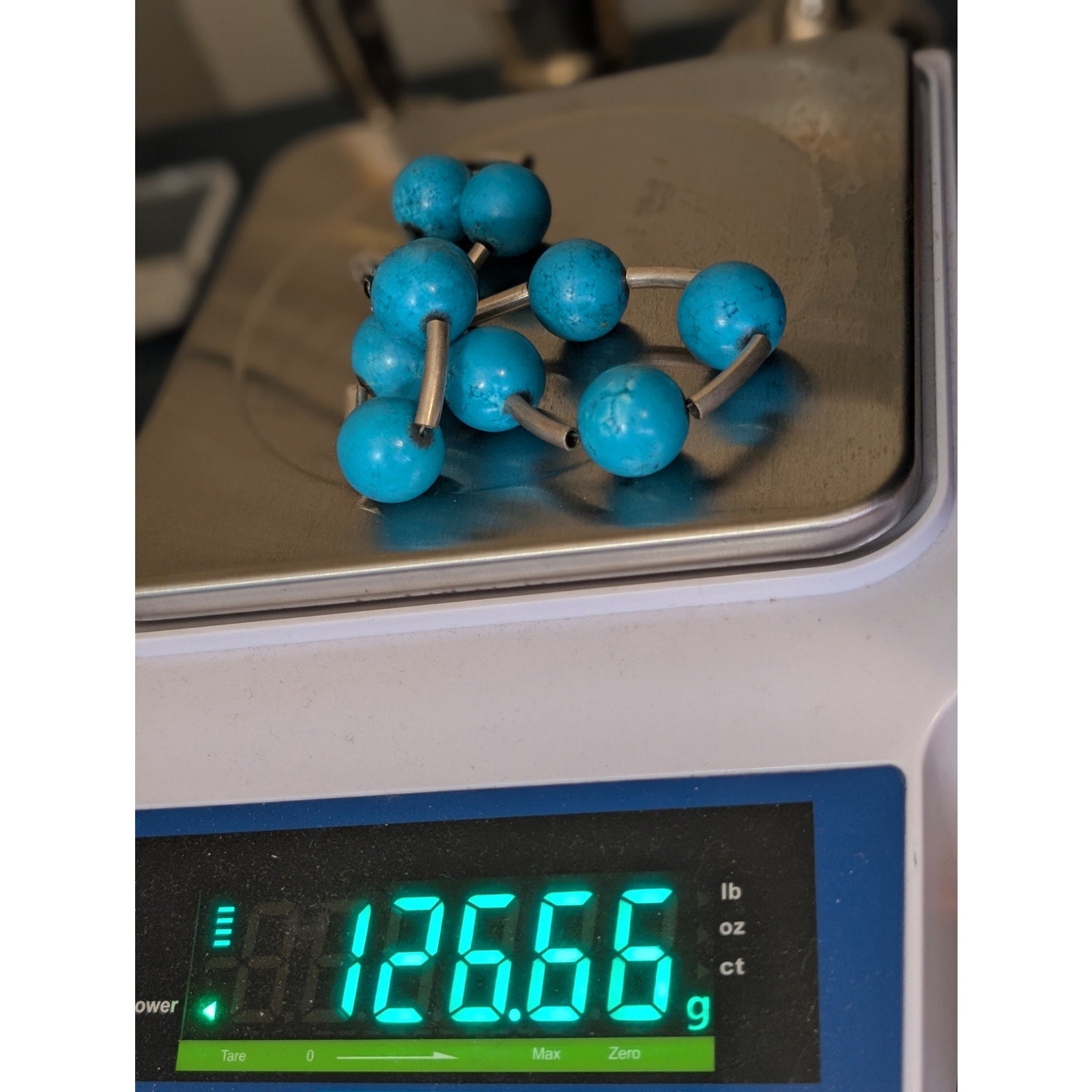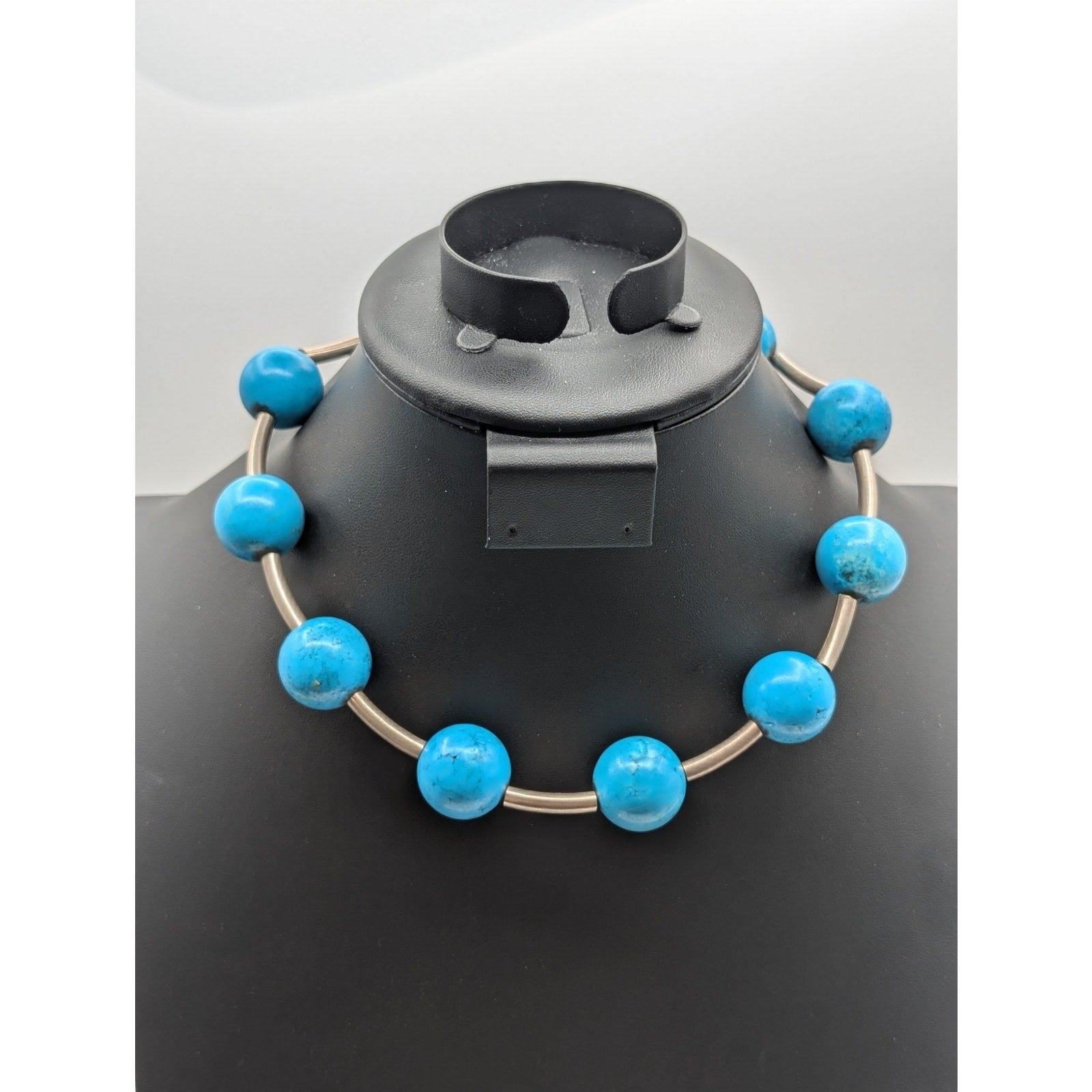 Heavy Blue Stone Bead Curved Silver Tone Rod Bead 17" Necklace
