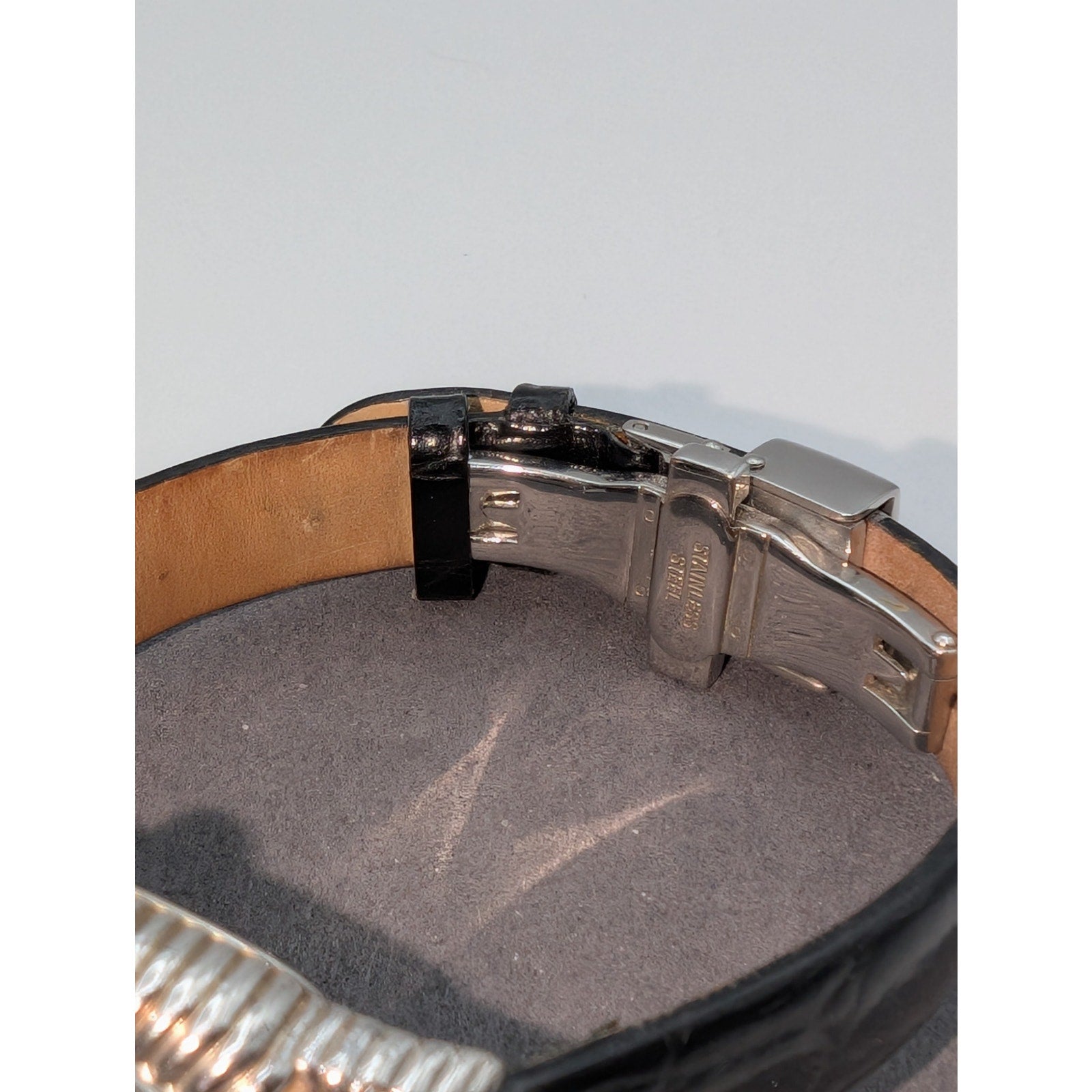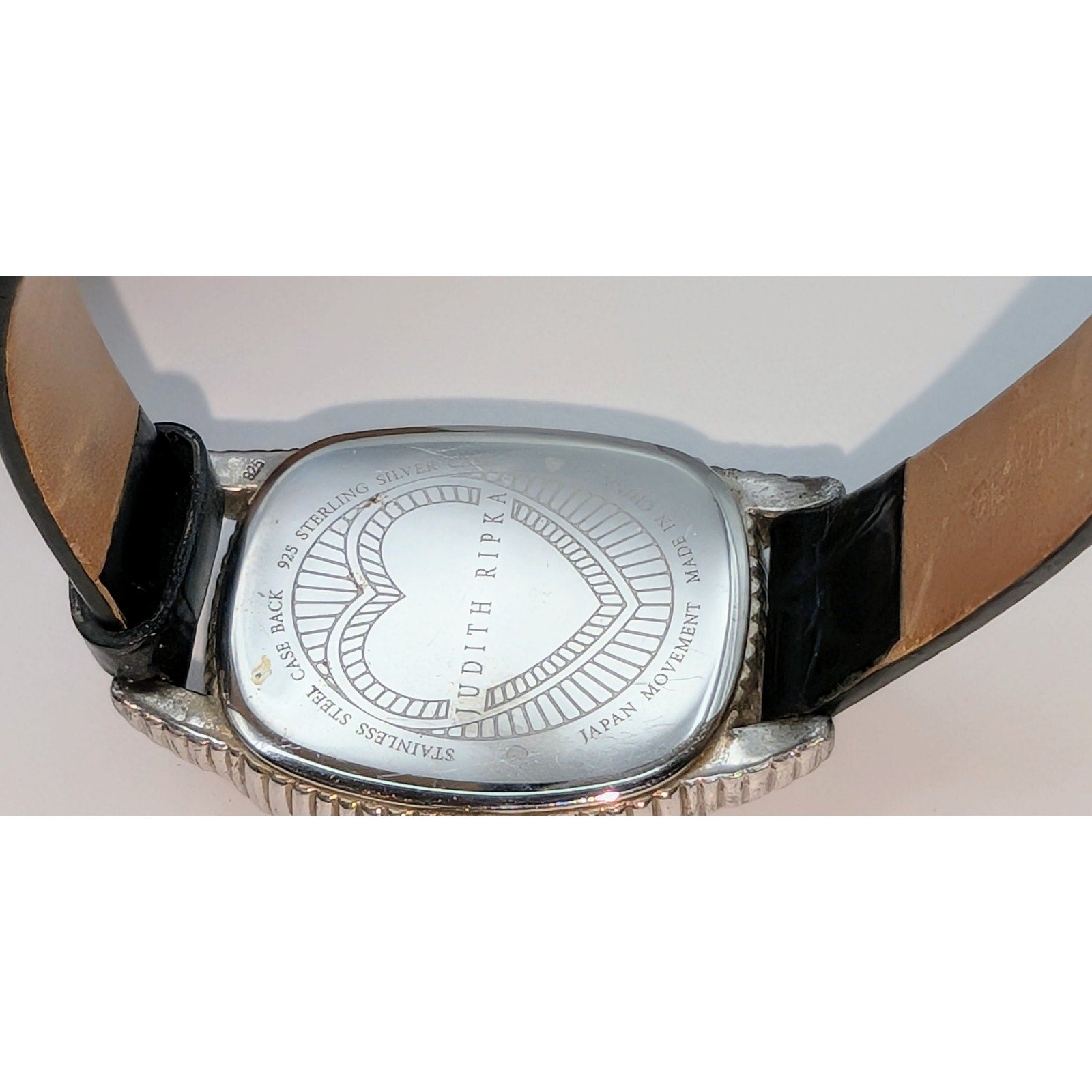 Judith Ripka MOP Diamonique Sterling Silver Case Genuine Leather Band Double Heart Watch. Sterling silver case/stainless steel back. Hour markers are diamonique/simulated diamonds. Blue hands. Japan quartz movement. Ribbed oval case. Croc embossed black leather strap with adjustable closure. Pre-owned, this watch is in great condition as far as it looks. Minimal scratching. Have not put in a battery so I have no idea if the watch works.