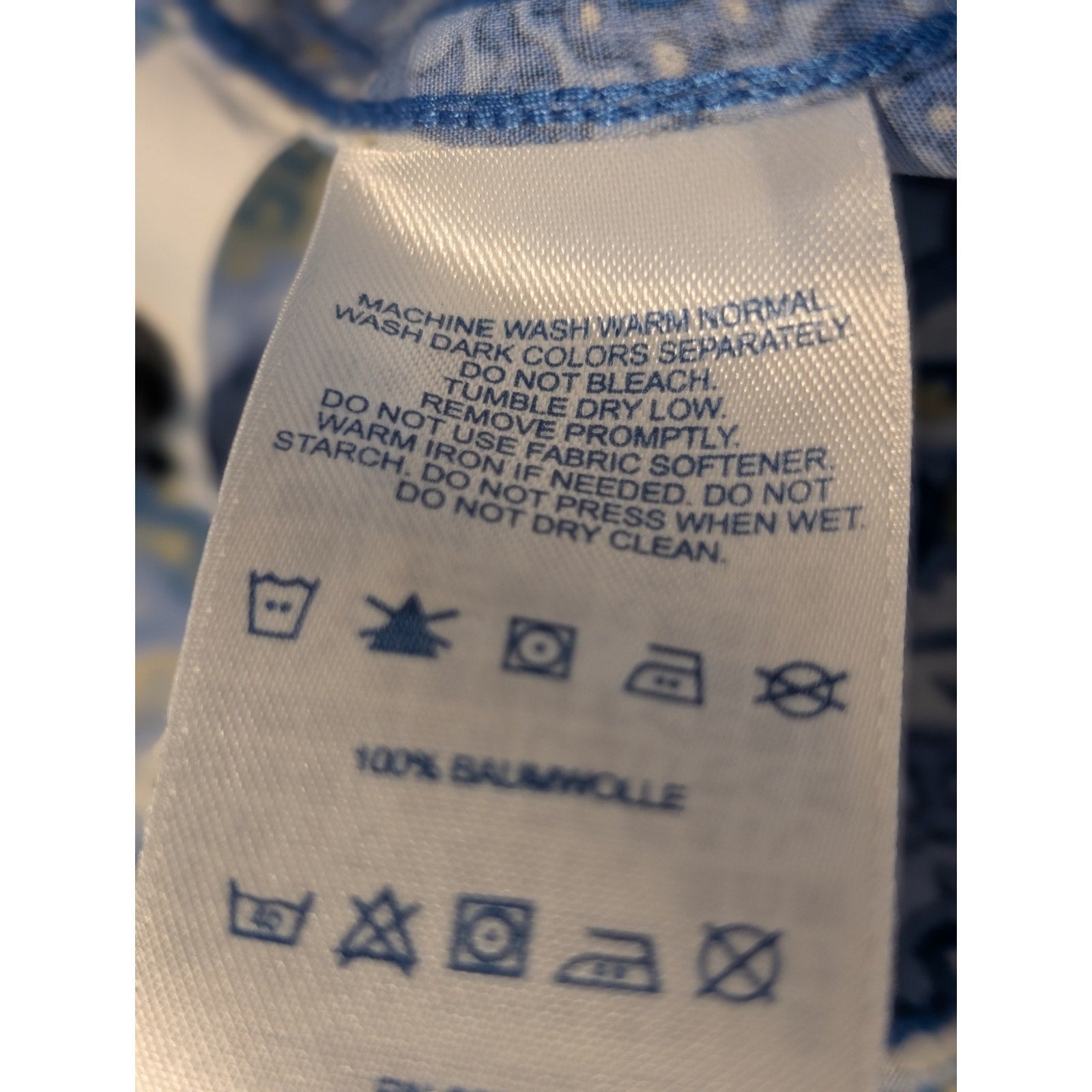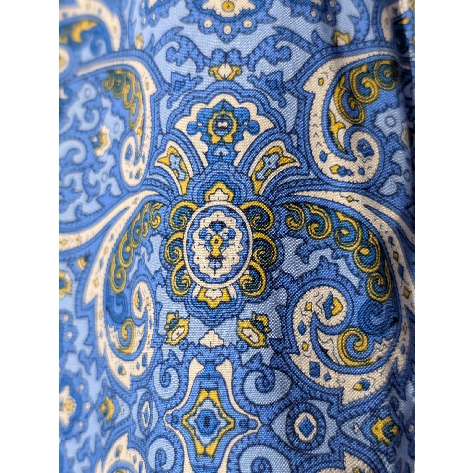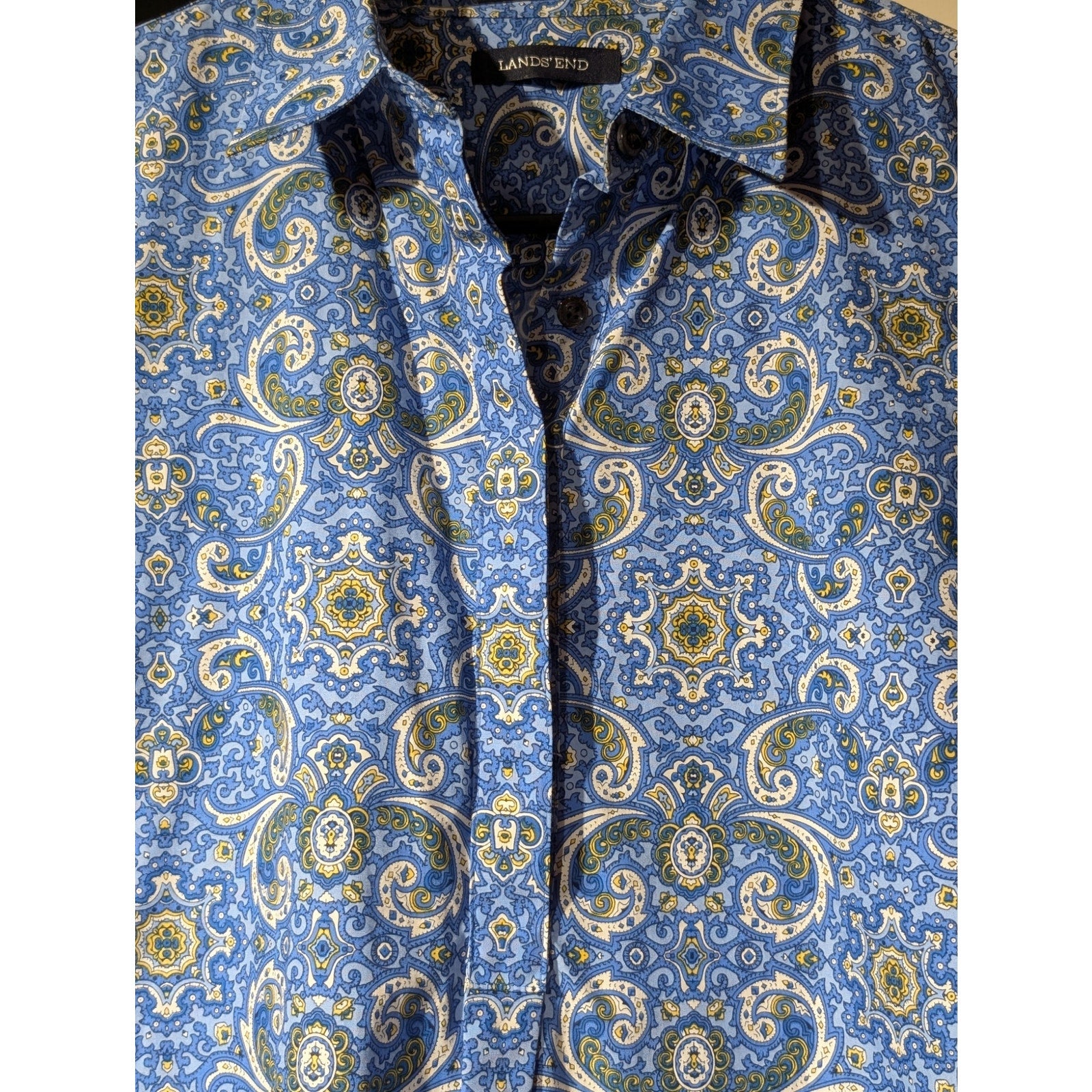 Lands' End Blue Yellow Paisley Half Button Popover No Iron Supima Womens' Tunic Shirt. No size tag but measures 23" armpit to armpit and 28" long. Pristine condition. Another similar shirt with similar measurements I bought at the same time has a size tag of 16.