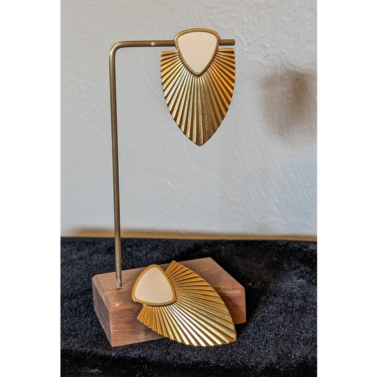 Large Boho Lightweight Leaf/Shield Cream Enamel Gold Tone Earrings