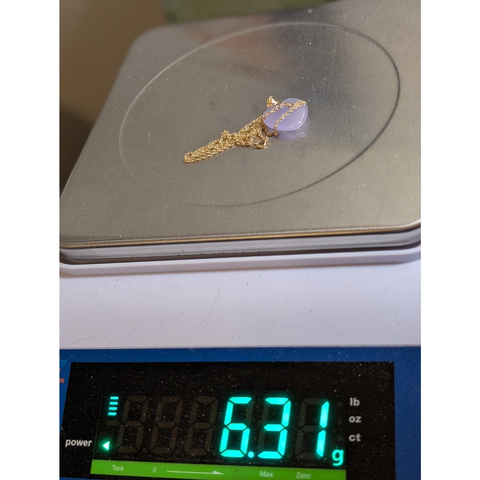 Lavender Jade Heart 14k Yellow Gold Pendant 18" Rope Chain Necklace. Pre-owned, this necklace is in excellent condition. The chain alone weighs 1.53g.