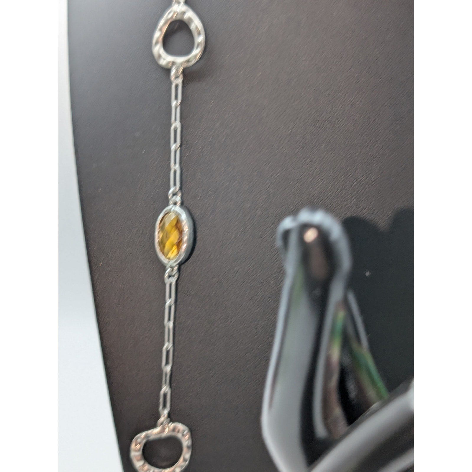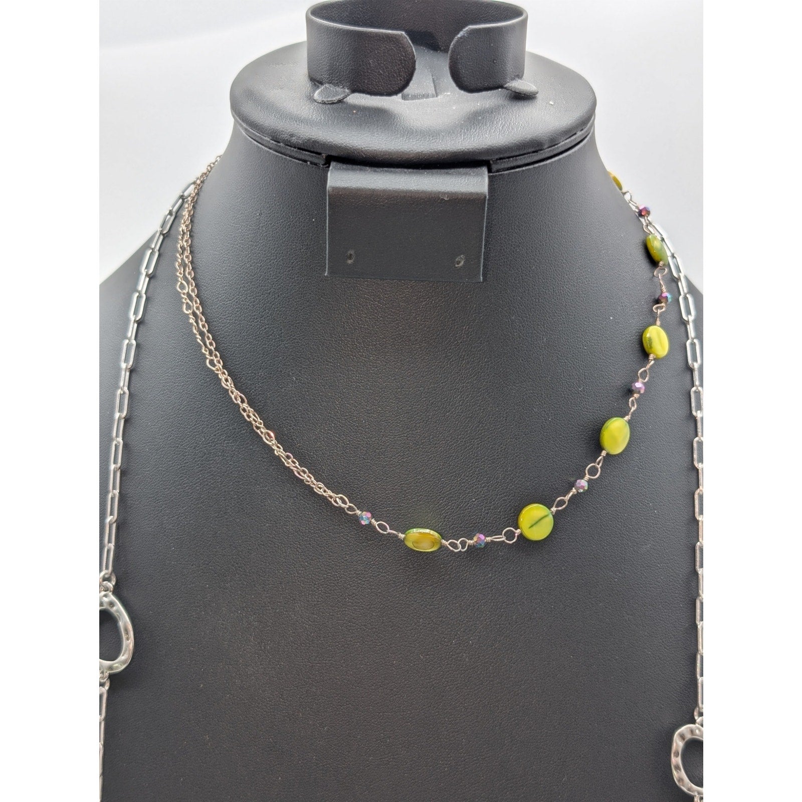 Long Lia Sophia & 925 Sterling Shell Necklaces & Colorful Brass Bangle Bracelet. The long silver tone chain necklace with bezel set faceted colored glass is Lia Sophia. The shorter choker necklace is shell that goes up one side of the necklace that is 925 sterling silver. The bracelet coordinates nicely. All pre-owned and in great condition.