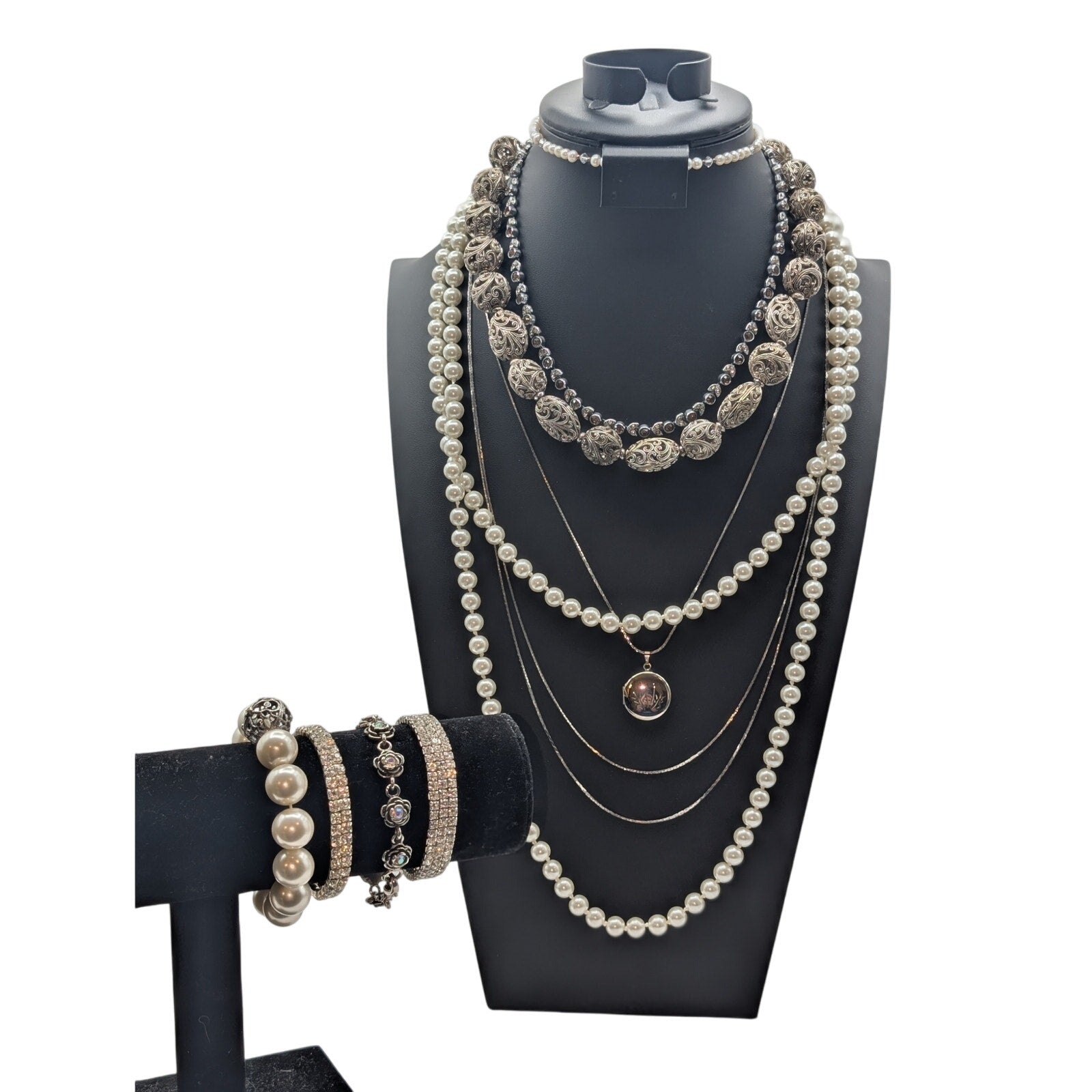 Lot of Nine Pieces of Faux Pearl Rhinestone Chain & Filigree Silver Tone Metal Jewelry. Pre-owned, this lot of mixed jewelry is in various conditions and being sold as is. (All wearable to excellent condition.) The items chosen for my lots are items I previously had set aside to sell but decided to lot up due to a high volume of inventory. Because they are lotted up and at a reduced price, I have not taken the time to clean them.