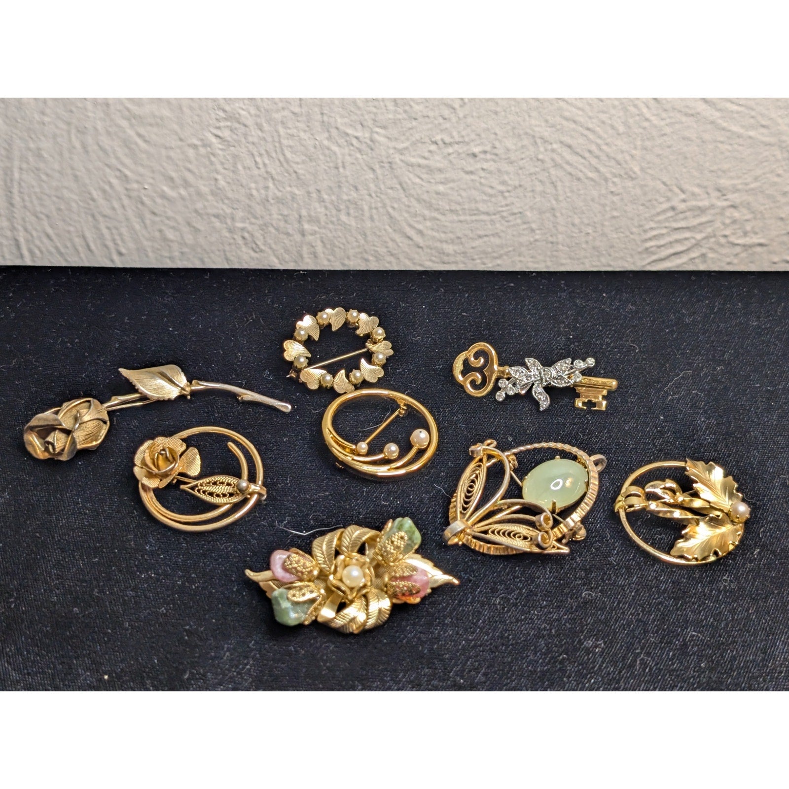 Lot of Eight Vintage Gold Tone Themed Brooches