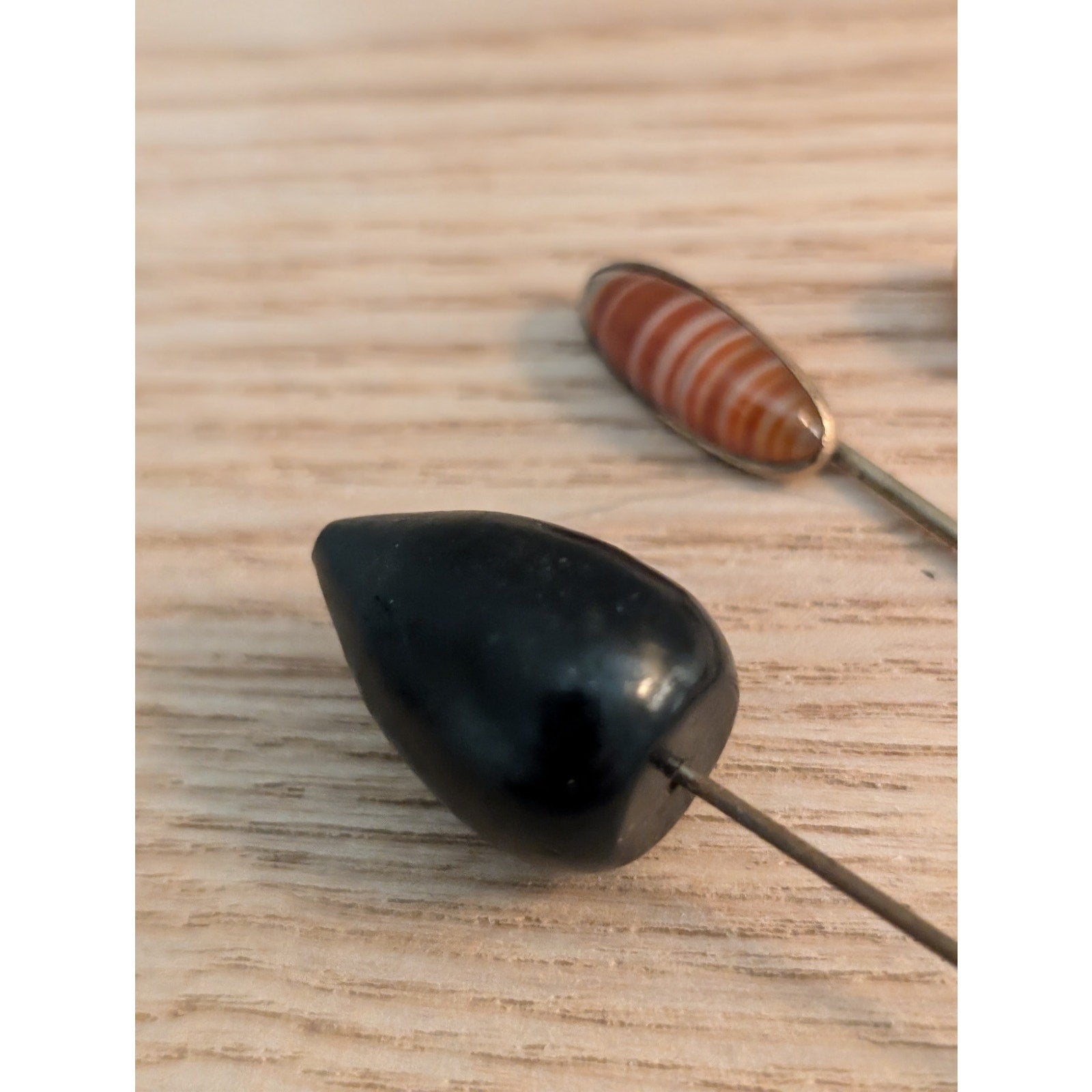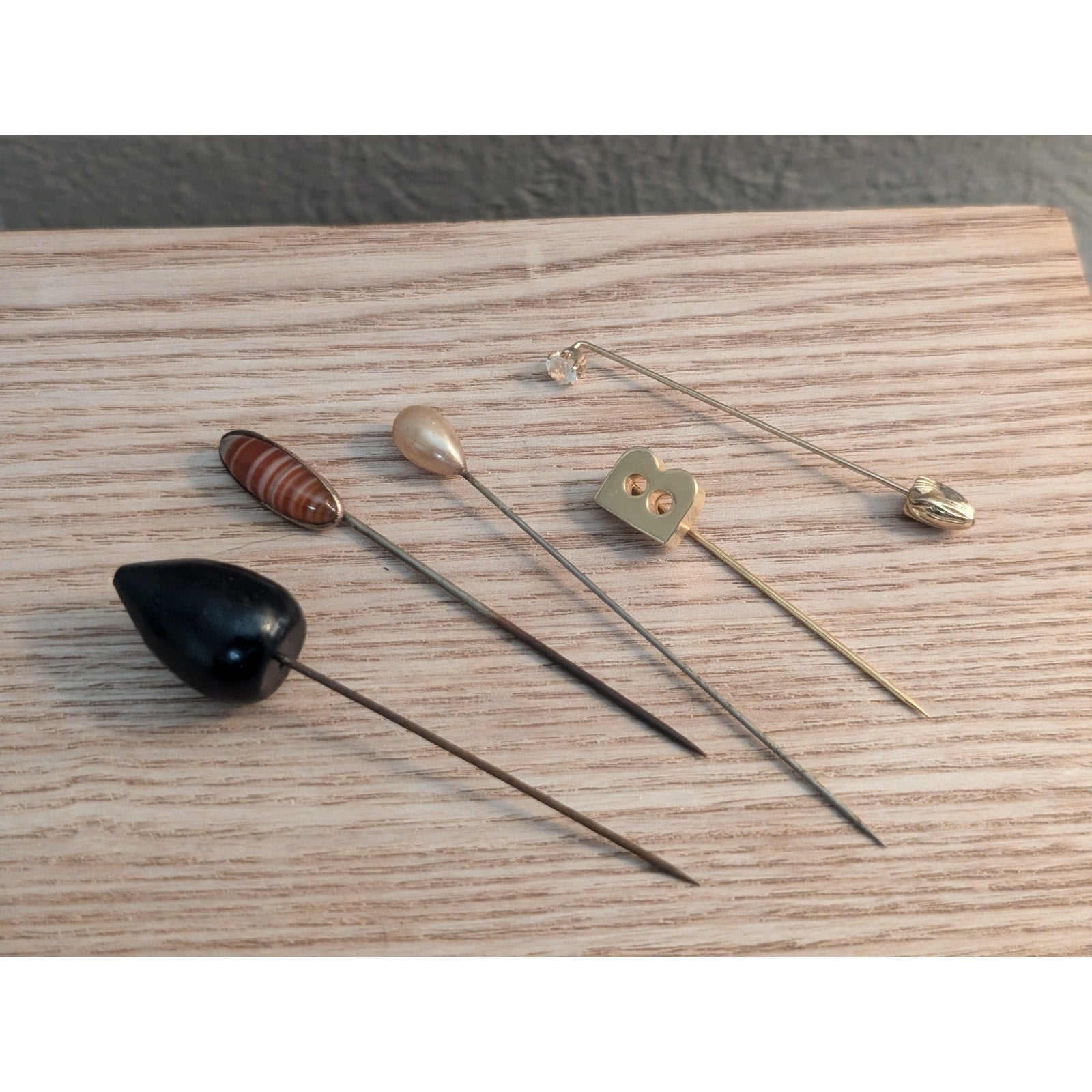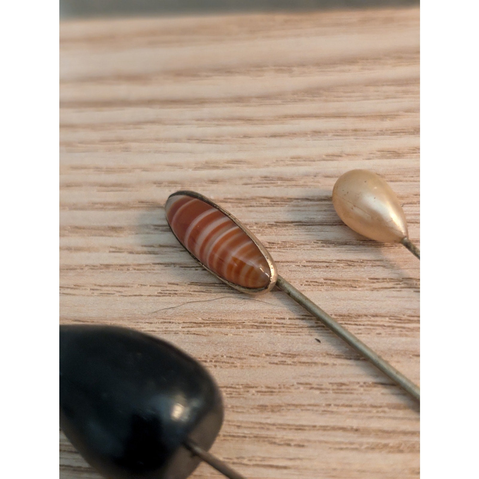Lot of Five Hatpins Antique Vintage to Modern. Pre-owned, these hat pins are in various conditions. They include a big wooden tear drop antique hatpin and an agate stone hat pin. Only one has its end cap. Sold as is.