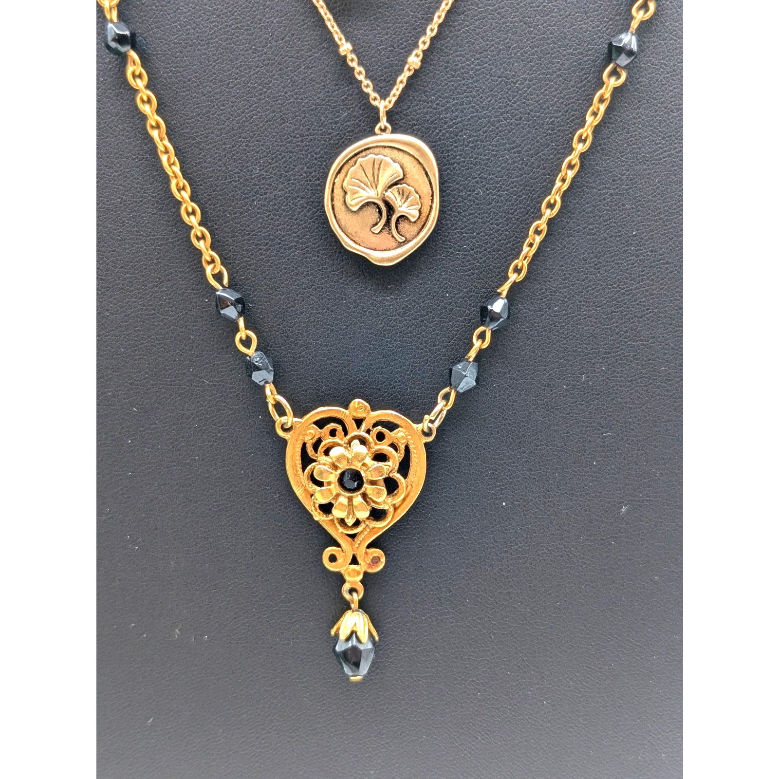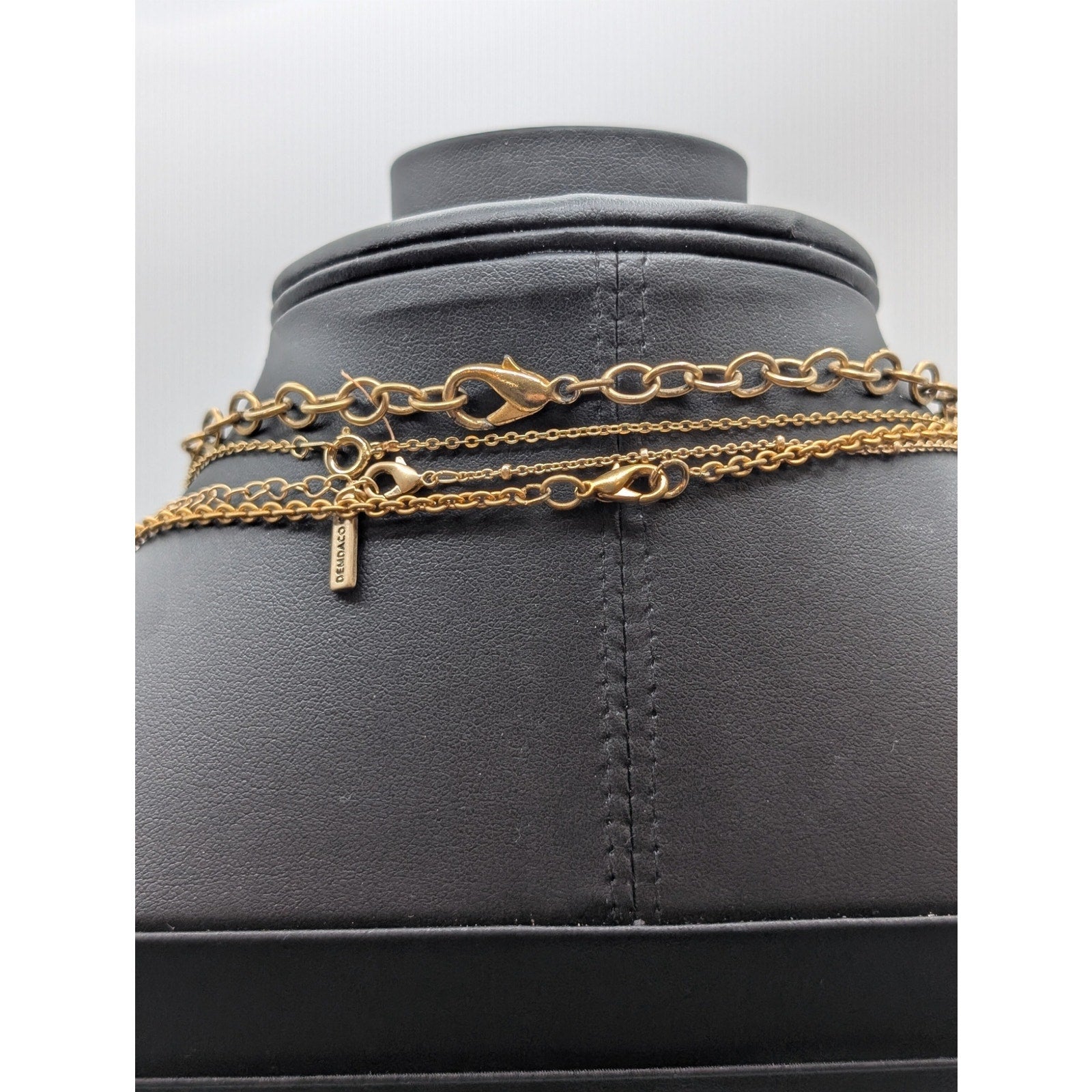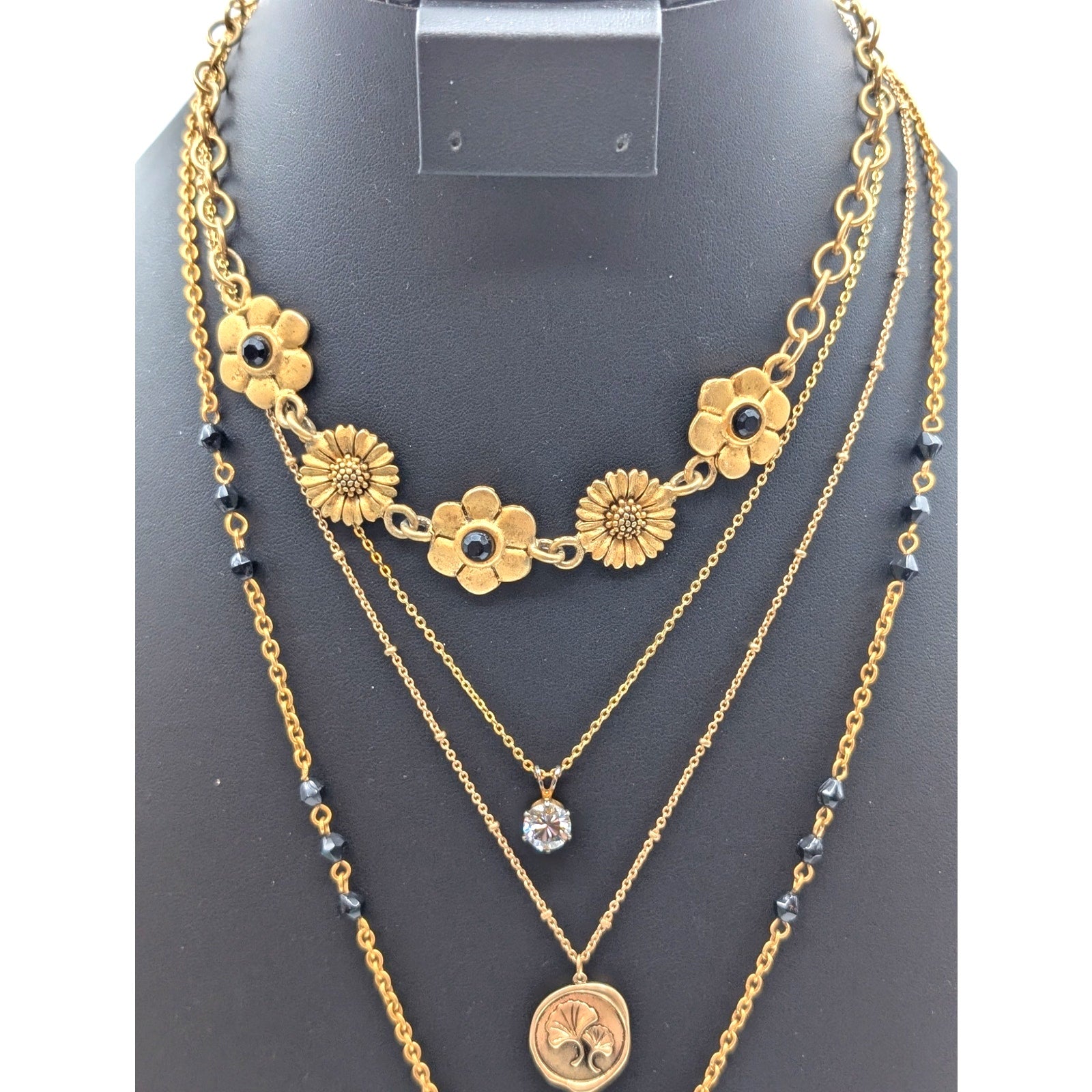 Lot of Four Gold Tone Floral Theme Beaded Necklaces. The flower necklace is by Express. The Solitaire CZ pendant necklace is unbranded. The ginkgo leaf necklace is by Demdaco, and the longest necklace is unbranded as well. All are in various conditions and being sold as is. I would consider them excellent condition. The flower necklace has a little bit of wear on the clasp.