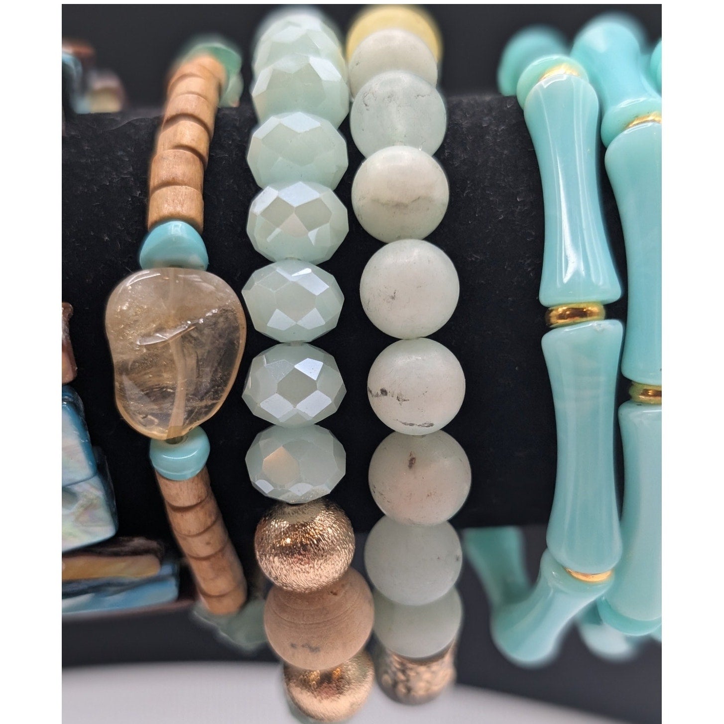 Lot of Ten Aqua Gold Tone Bracelets. Pre-owned, this lot of bracelets is in various conditions and being sold as is (all wearable to excellent). The items chosen for my lots are items I previously had set aside to sell but decided to lot up due to a high volume of inventory. Because they are lotted up and at a reduced price, I have not taken the time to clean them or closely inspect them.