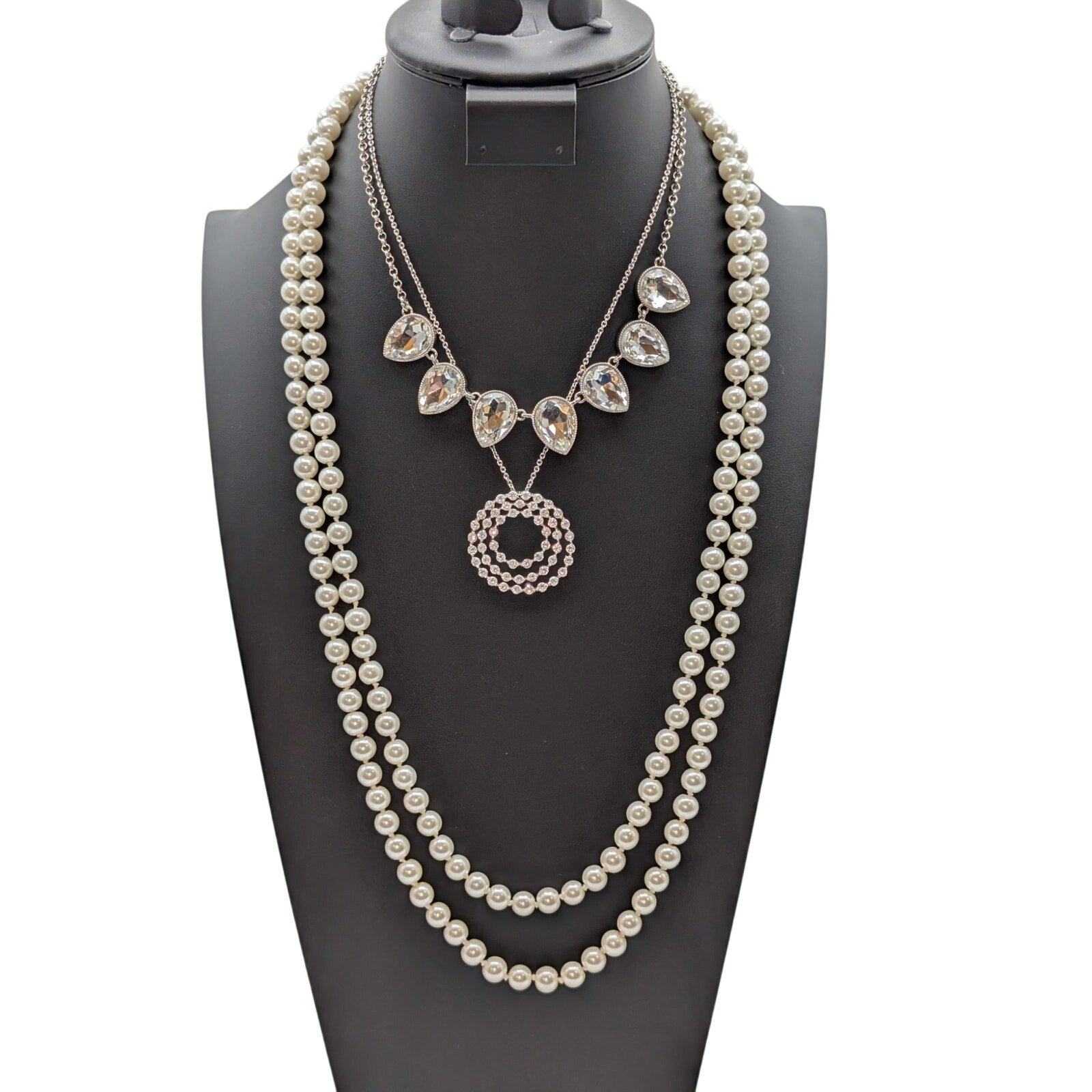 Lot of Three Faux Pearl Rhinestone Silver Tone Necklaces To Layer or Wear Alone