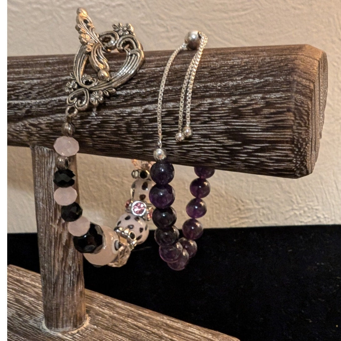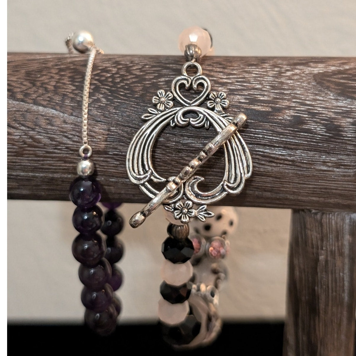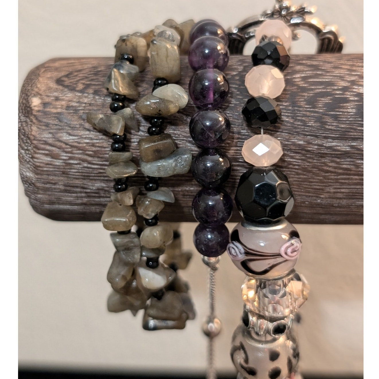 Lot of Three Stone Chip Gemstone Glass Bead Bracelets. Pre-owned, these bracelets are in excellent condition. The stone chip bracelet has gray/green stone chips. They don't register on the gem tester, so I'm not sure what they are. The purple beads are amethyst and have a sterling draw cord that makes it adjustable, and the glass beads are pink and black with a fancy clasp and rhinestone rondelle beads. All being sold as is.