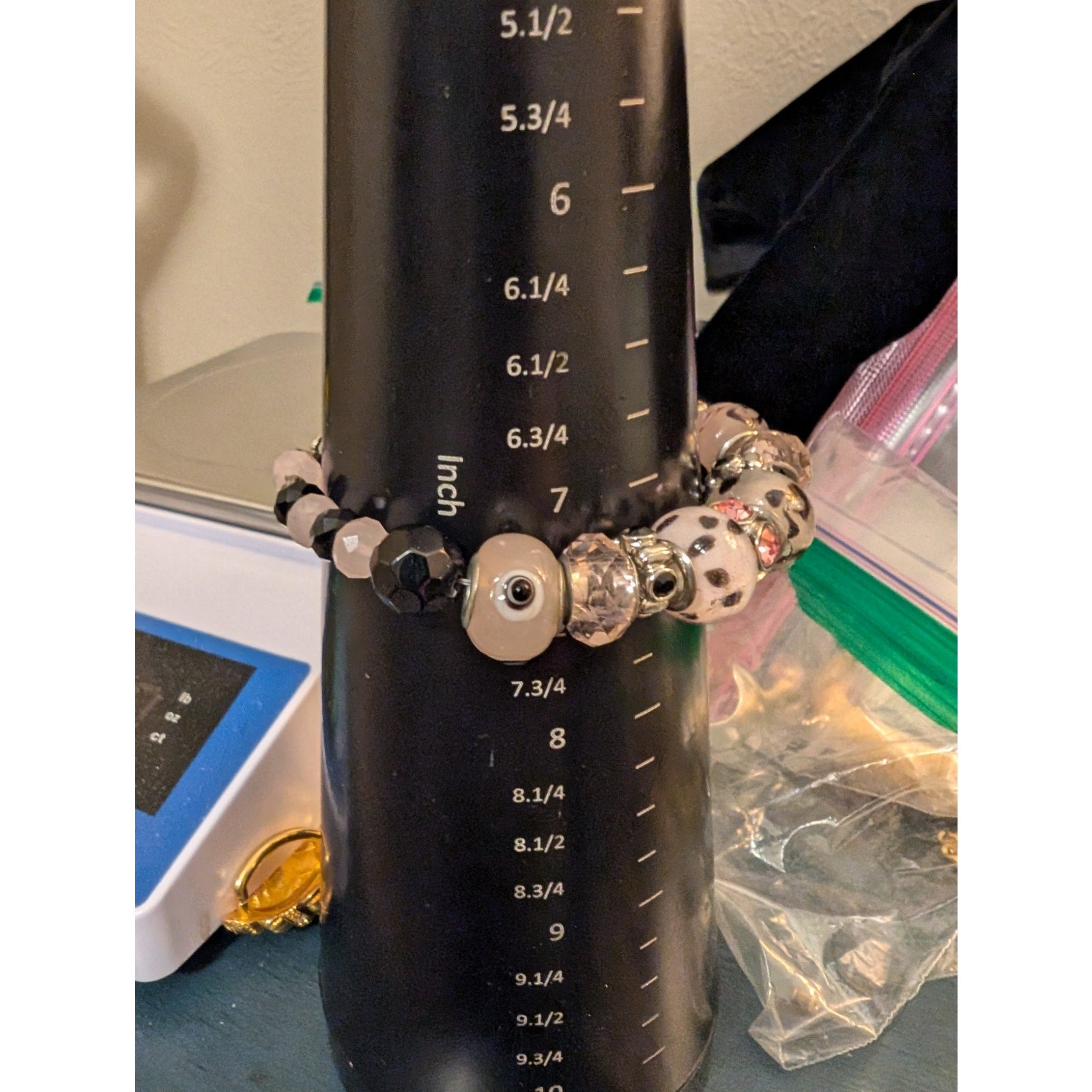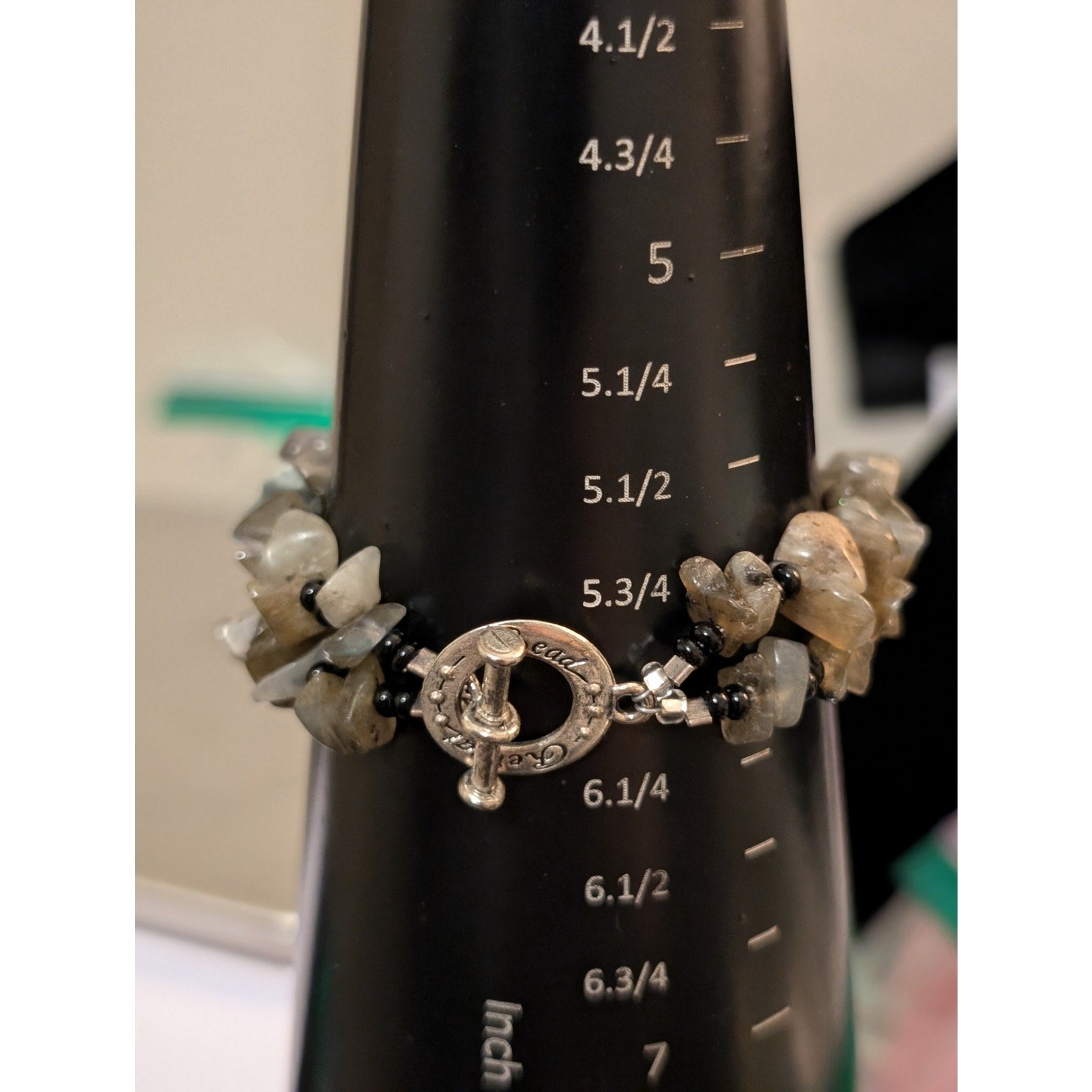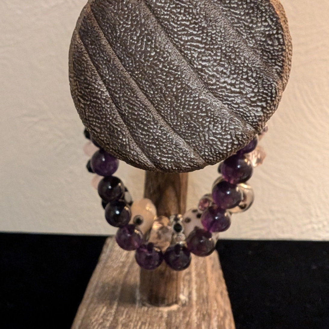Lot of Three Stone Chip Gemstone Glass Bead Bracelets. Pre-owned, these bracelets are in excellent condition. The stone chip bracelet has gray/green stone chips. They don't register on the gem tester, so I'm not sure what they are. The purple beads are amethyst and have a sterling draw cord that makes it adjustable, and the glass beads are pink and black with a fancy clasp and rhinestone rondelle beads. All being sold as is.