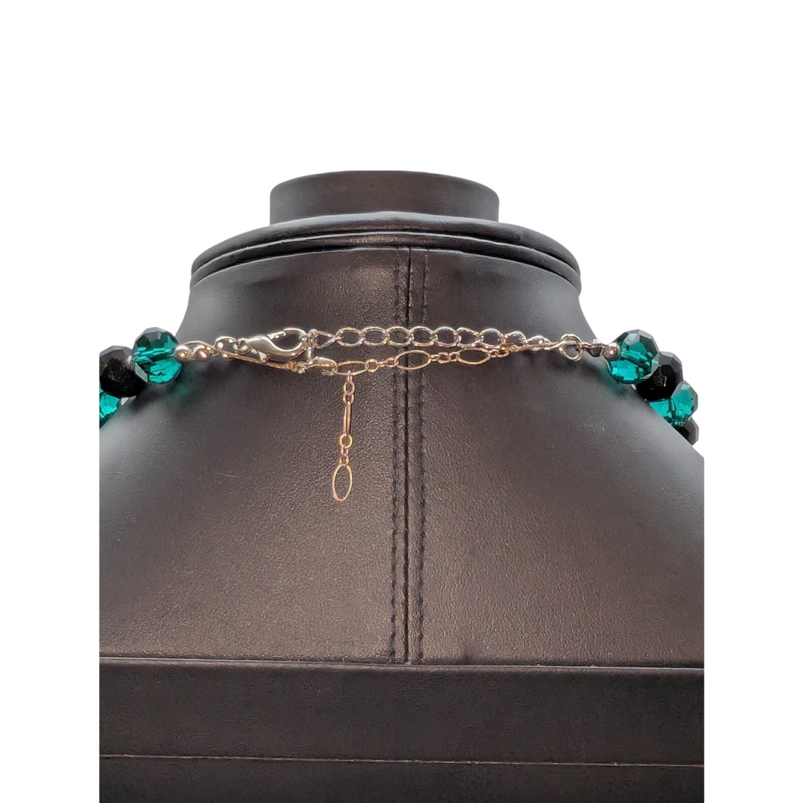 Lot of Two Glass Crystal Necklaces -- Black & Green Glass Crystal. The black and green crystal beaded silver tone necklace measures 18.25"-20.5" long. The crystal strung on the cord has a 925 sterling silver clasp and chain. Pre-owned, these necklaces are in great condition.