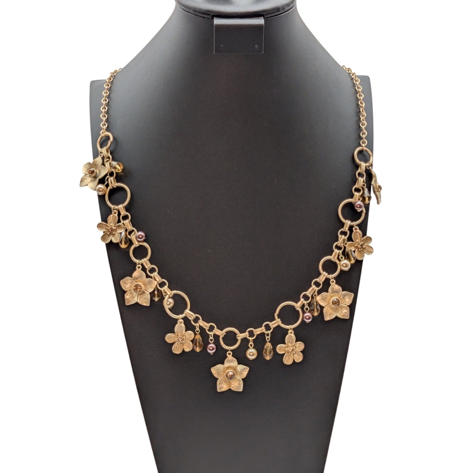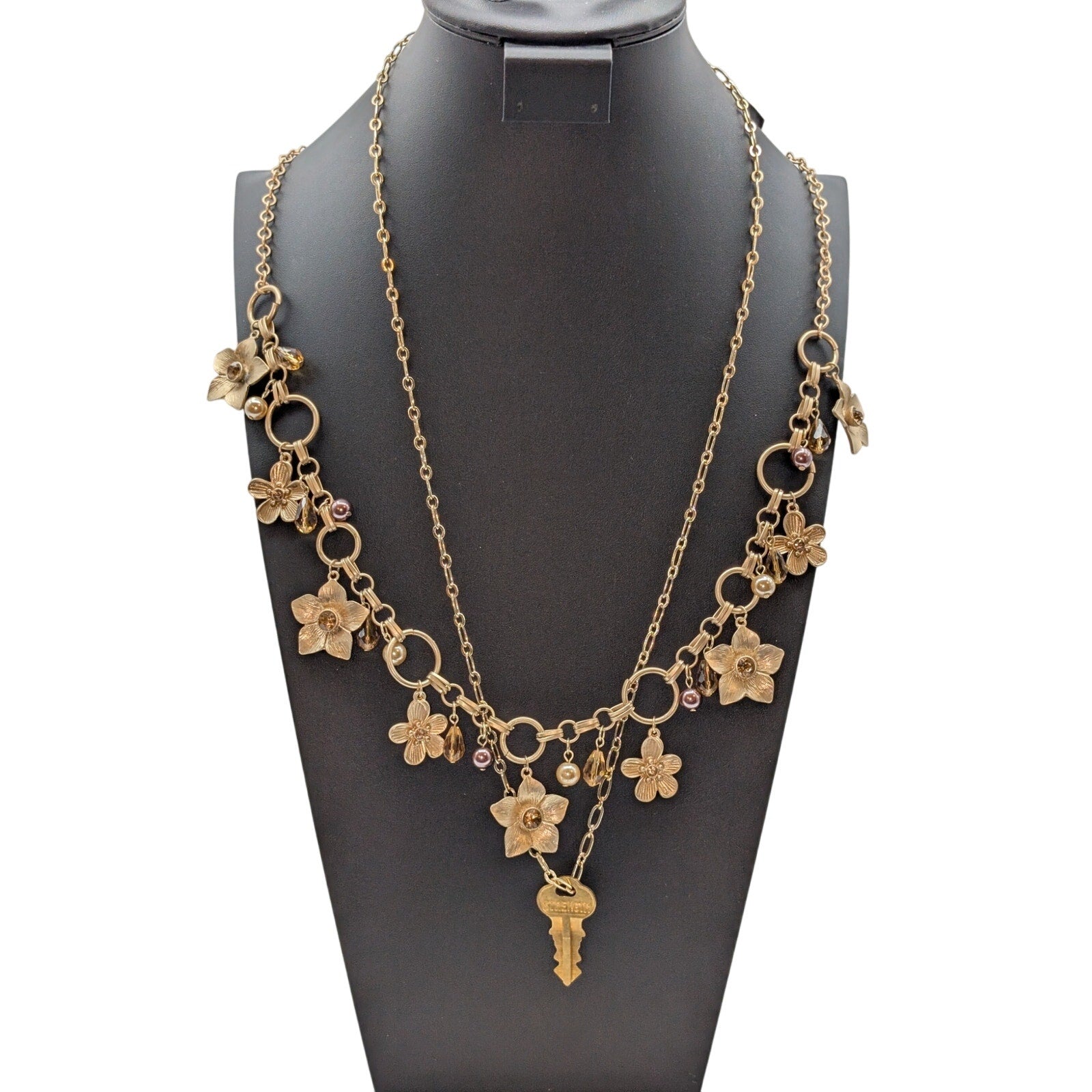 Lot of Two Gold Tone Dangling Flowers & A Giving Key Necklaces. Pre-owned, this lot of necklaces is in excellent condition.