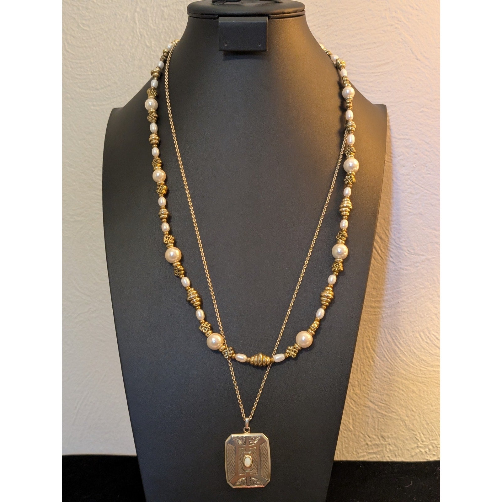 Lot of Two Gold Tone Necklaces Faux Pearl Gold Bead & Sarah Cov Opalite Pendant