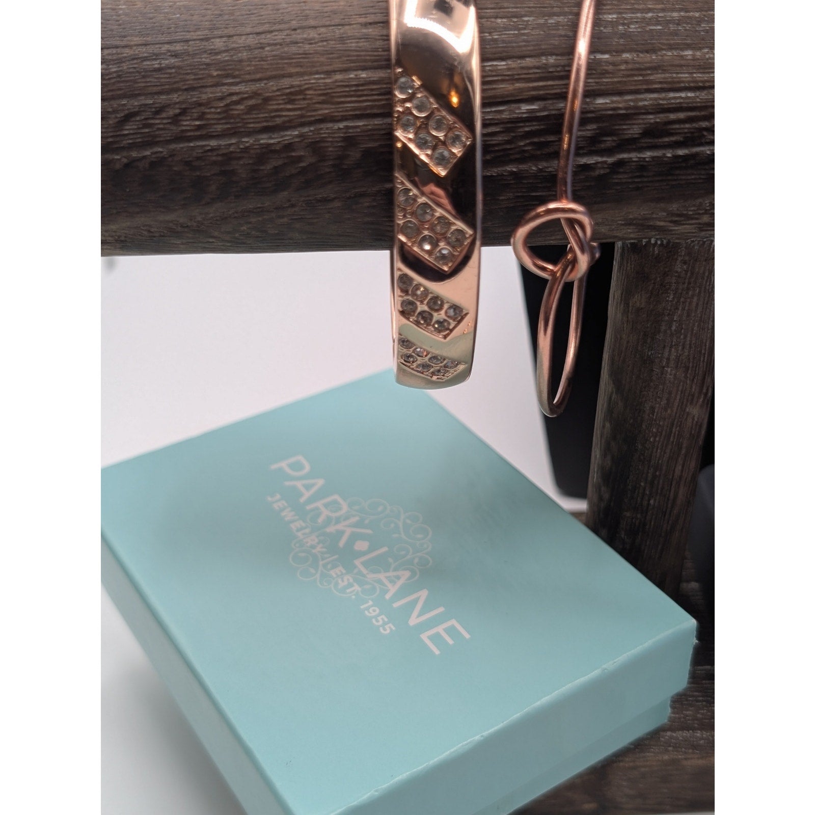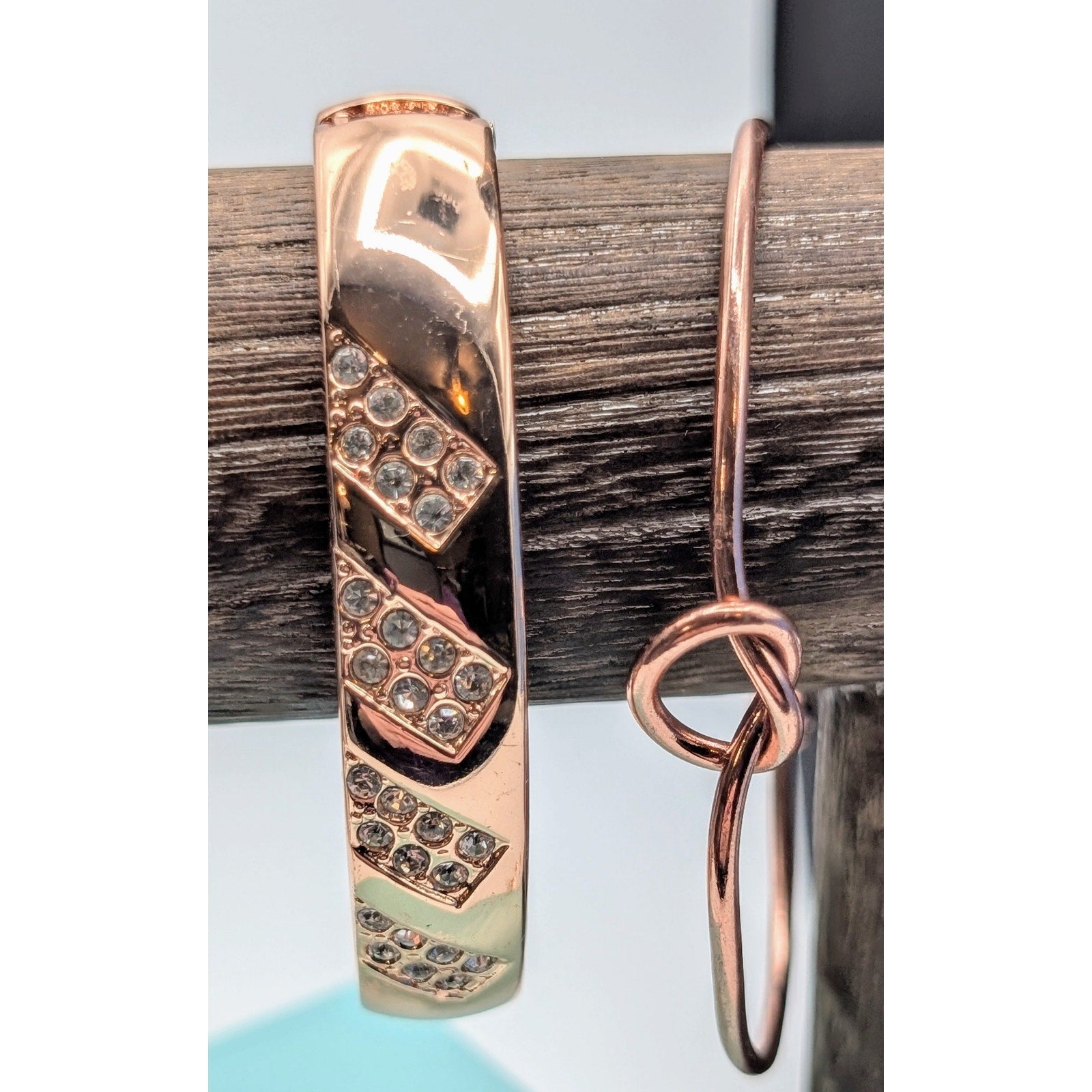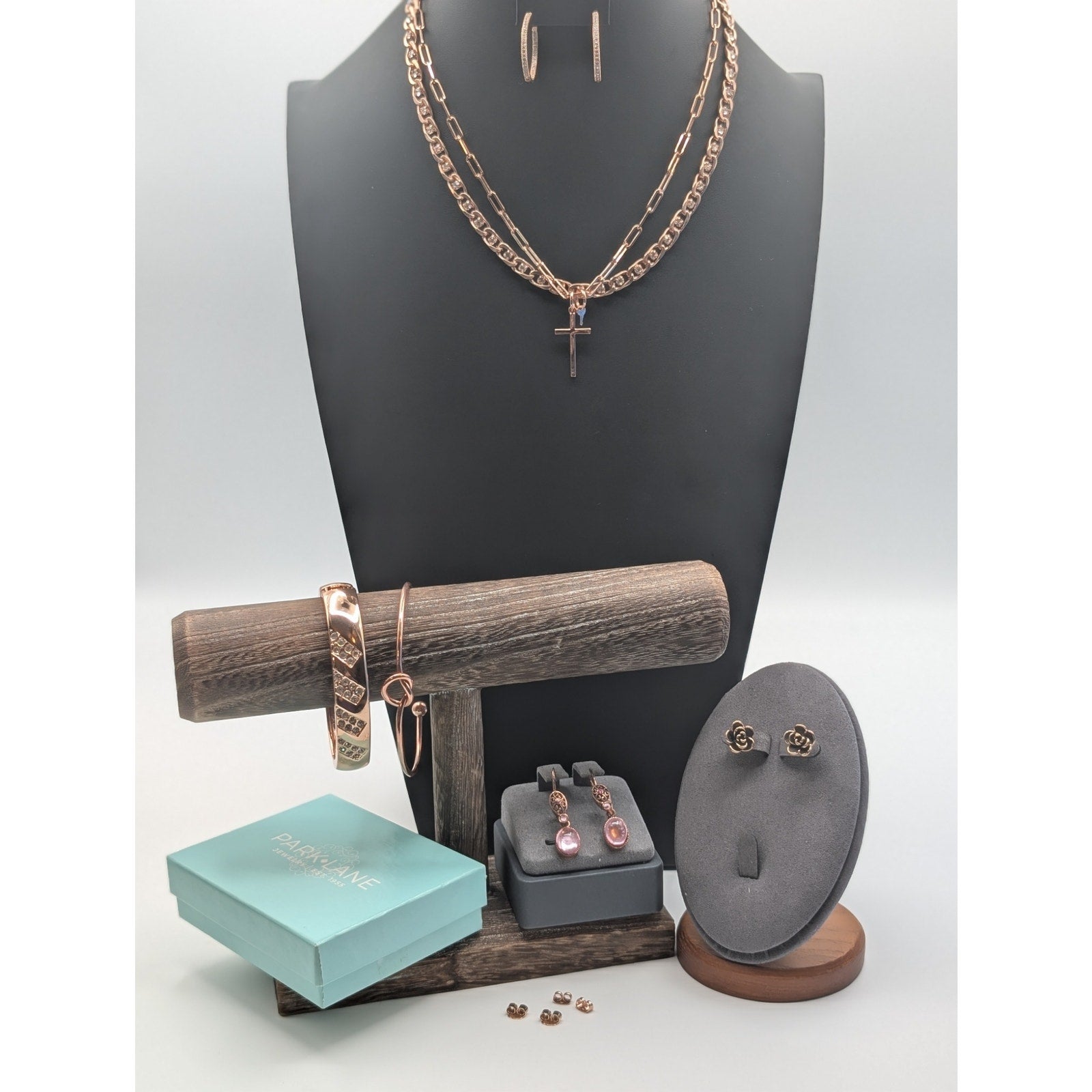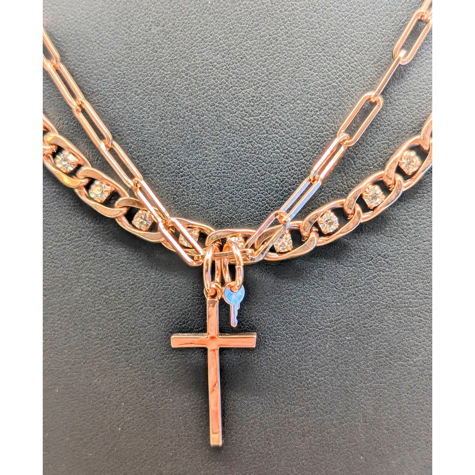 Lot of Two Necklaces Two Bracelets & Three Pair Earrings Rose Tone Metal. The cross and key necklace is new in original box. The cabochon dangle earrings are vintage Avon. Pre-owned, this lot of bracelets is in various conditions and being sold as is. All wearable good to excellent. The items chosen for my lots are items I previously had set aside to sell but decided to lot up due to a high volume of inventory. Because they are lotted up and at a reduced price, I have not taken the time to clean them.