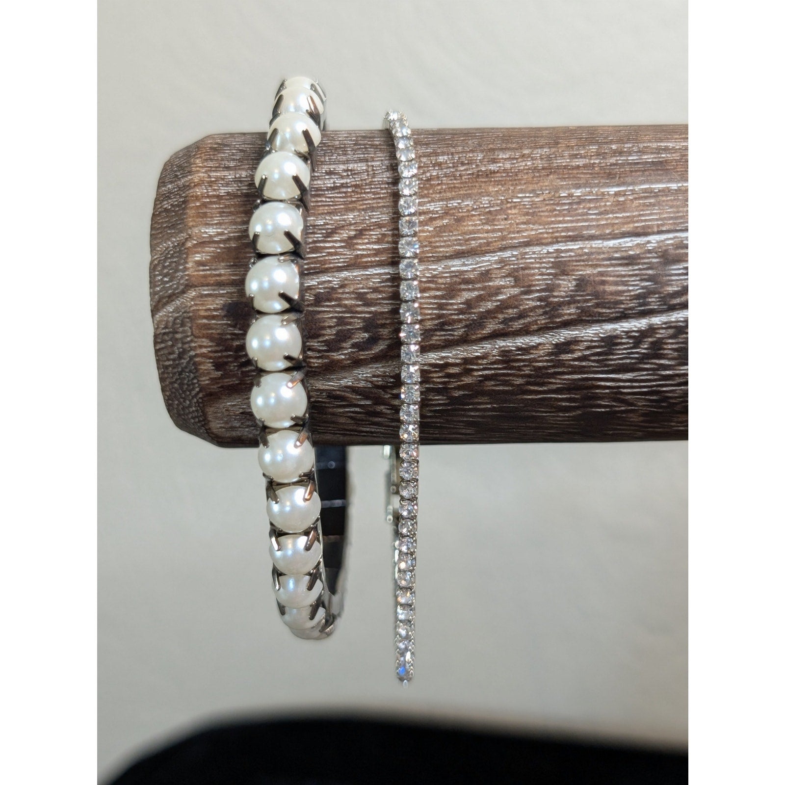 Lot of Two Silver Tone Rhinestone Fold Over Clasp & Faux Pearl Stretch Bracelets. Pre-owned, these bracelets are in excellent condition.