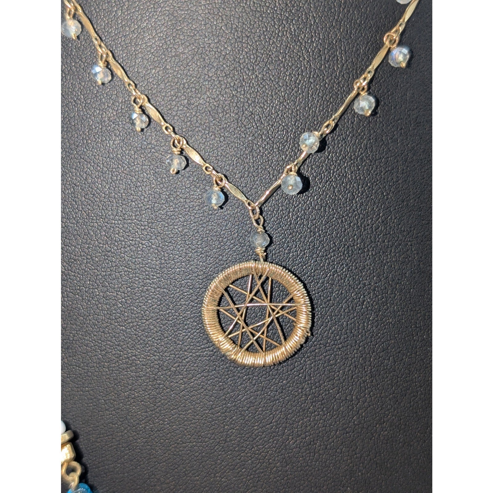 Lot of Two Vintage Boho Glass Beaded Gold Tone Necklaces. The shorter necklace has a 14k gold filled chain. The longer necklace (doubled in this photo) has a bead that is chipped as seen in the photos. Otherwise, these necklaces are in great vintage condition.