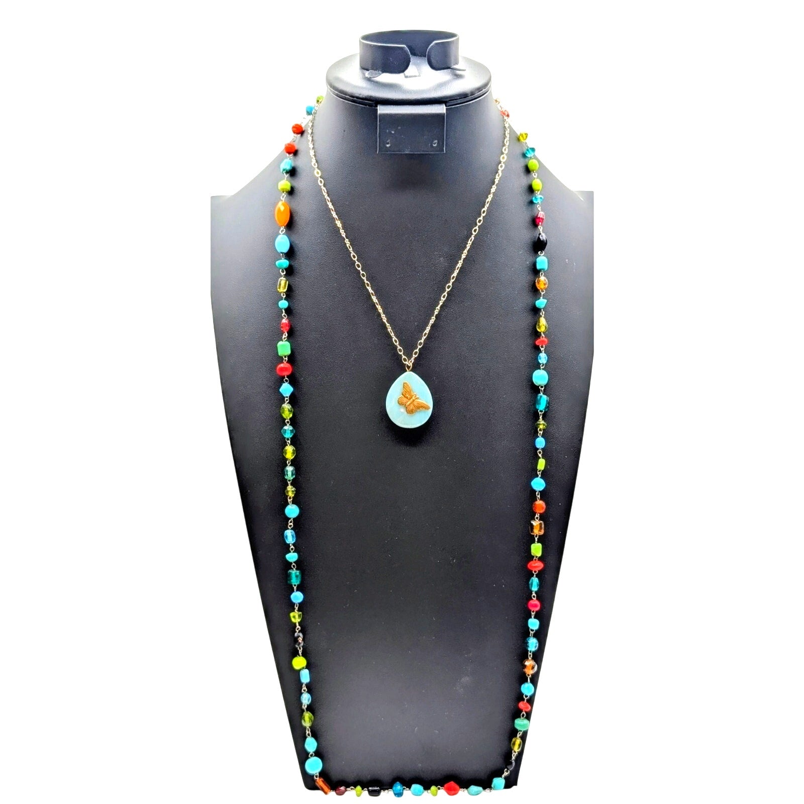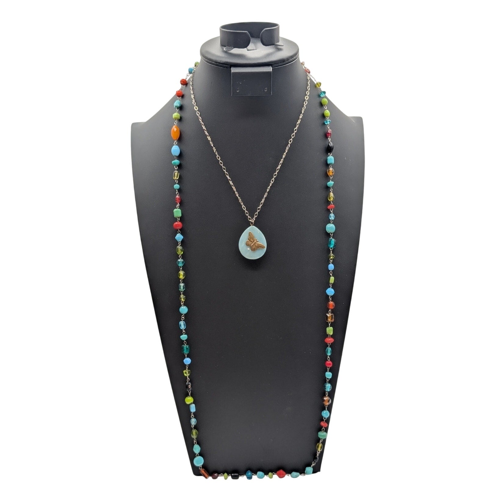 Lot of Two Vintage Glass & Stone Bead Necklaces. Long glass bead strand measures 38" with no clasp, so it may not be able to be doubled on some people unless a clasp could be added. Multi-colored glass beads. The stone pendant I think is a larimar, but I'm not 100% positive. This necklace is on a silver tone chain and measures 18" long. Both necklaces are pre-owned and in great condition.