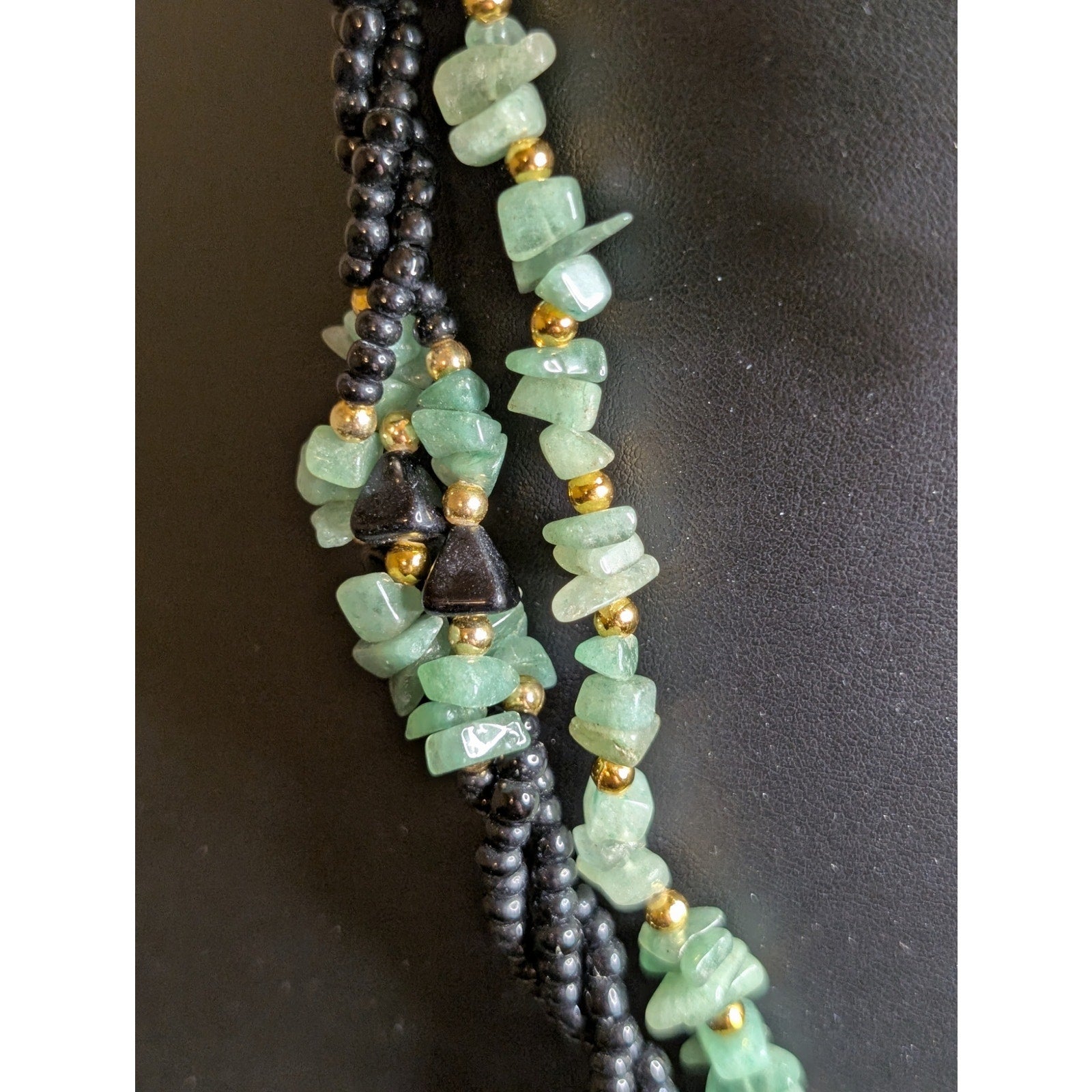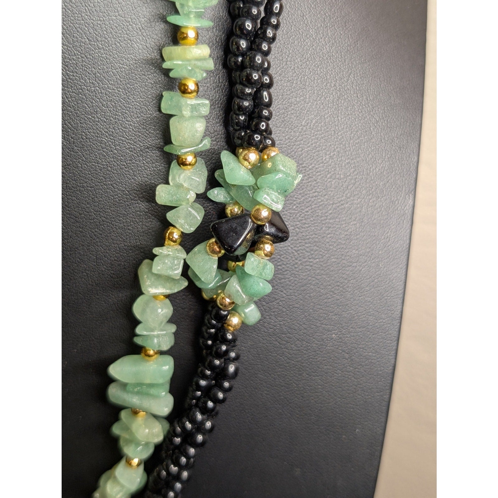 Lot of Two Vintage Green, Black & Gold Tone Beaded Necklaces & Matching Earrings. I think the black stones are onyx and the green adventure, but I am not possible. I know they are stone. The smaller black beads are glass. Both necklaces measure approximately 22" long. There are two pair of earrings, one pair has all green and gold tone beads and the other pair matches the ones in the photos. Pre-owned, all pieces are in various conditions and being sold as is. All wearable.