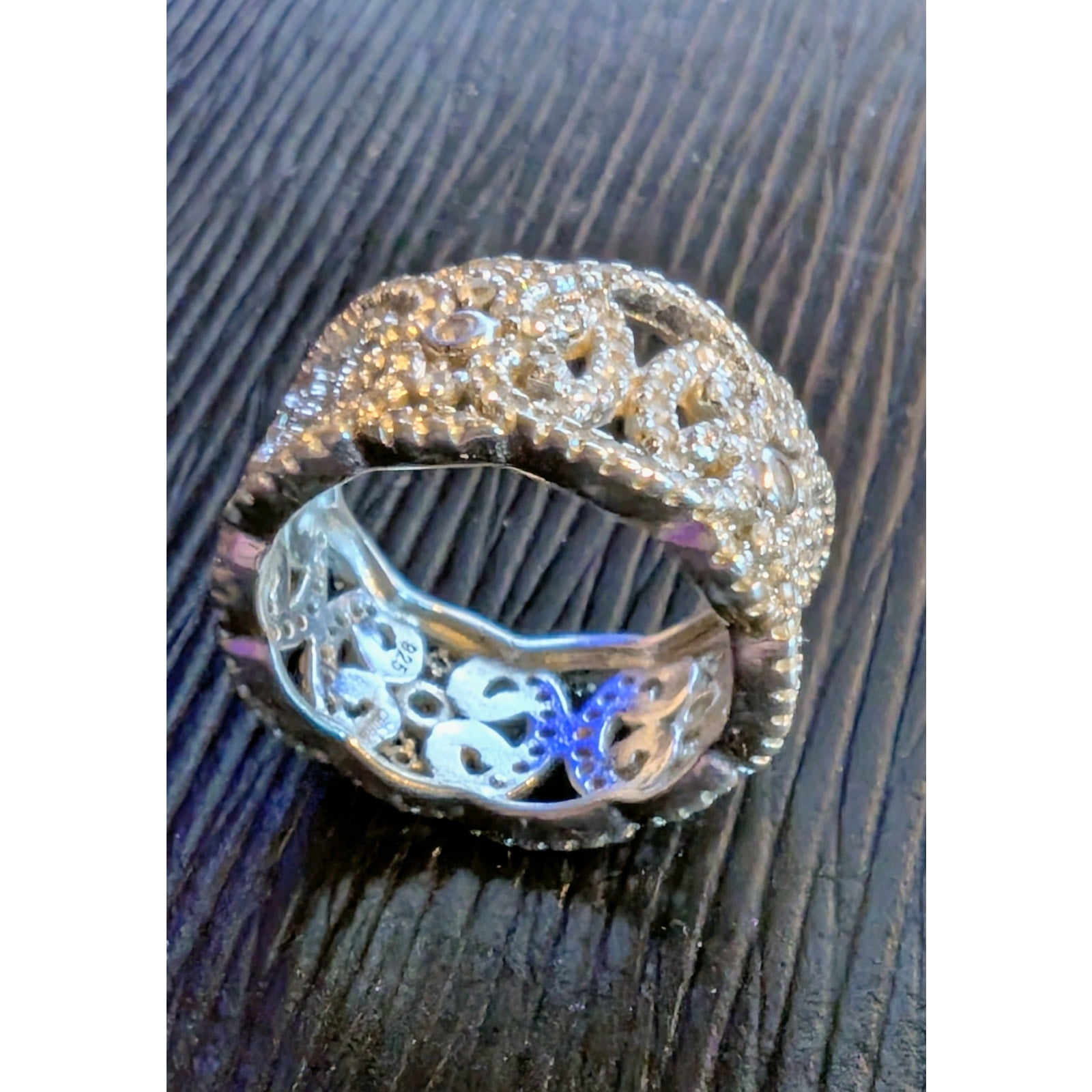Marked 925 Sterling Silver CZ Encrusted Eternity Band Ring Size 5.25. Pre-owned, this ring is in excellent condition. Ring sits between a 5.25 and 5.5 but because of its width, I'm saying it will fit a 5.25 best.