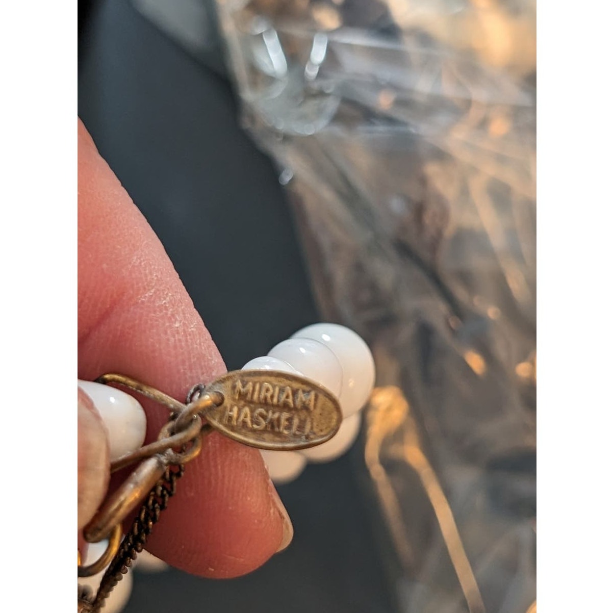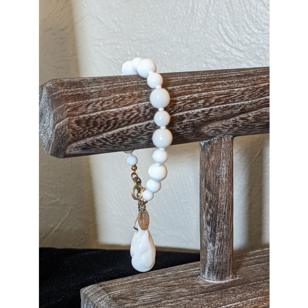 Miriam Haskell Vintage White Milk Glass Bead Dangle Charm Safety Chain Signed Bracelet. Pre-owned, this vintage rare find Miriam Haskell bracelet is in excellent condition. Wear only on the chain. Can't find one just like it on the internet.