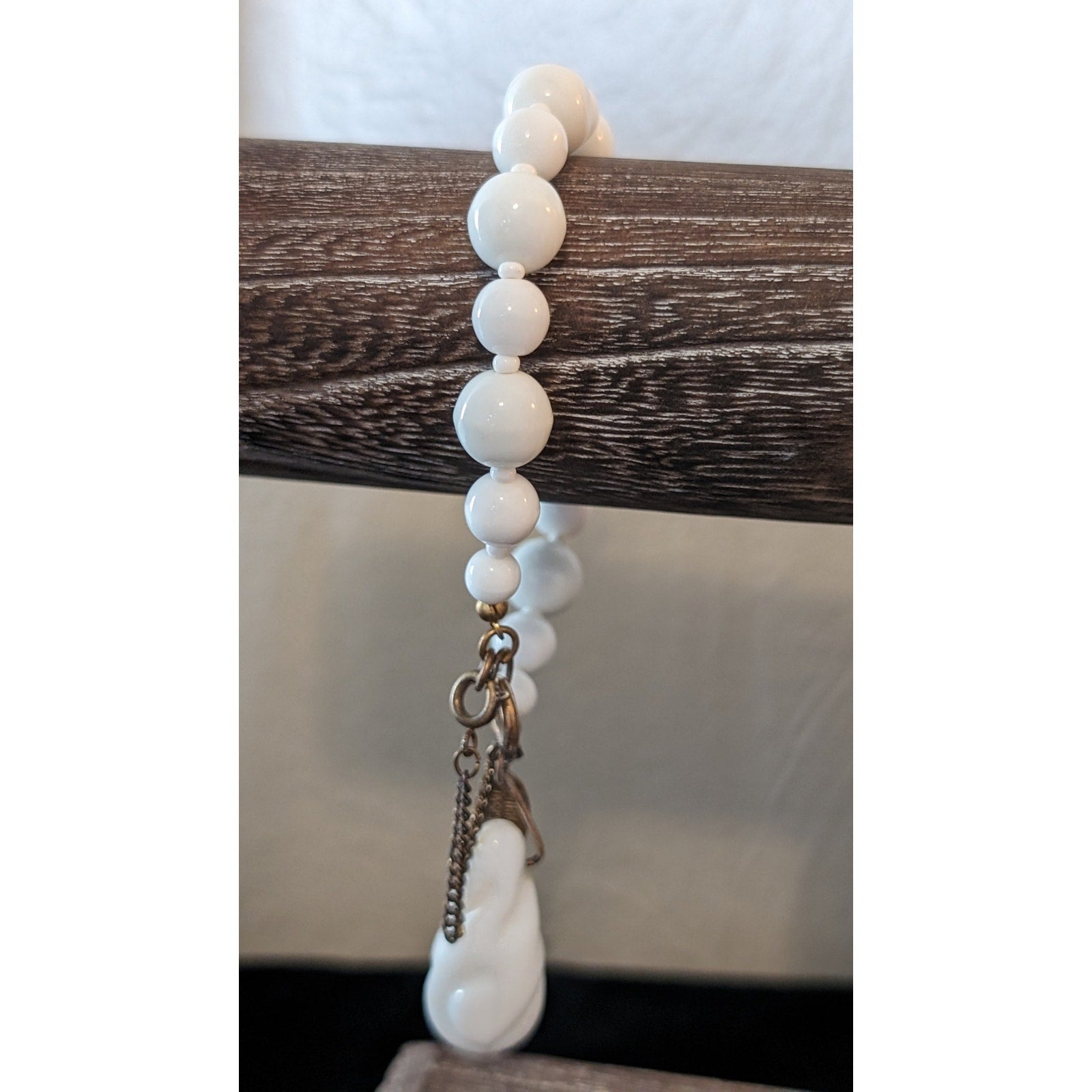 Miriam Haskell White Milk Glass Bead Dangle Charm Safety Chain Signed Bracelet