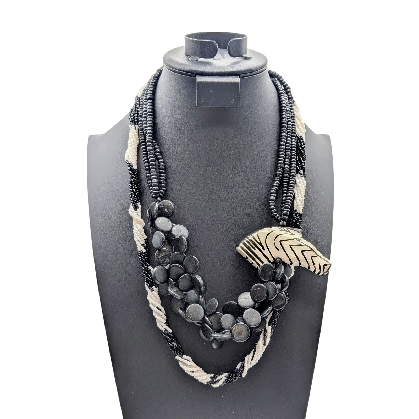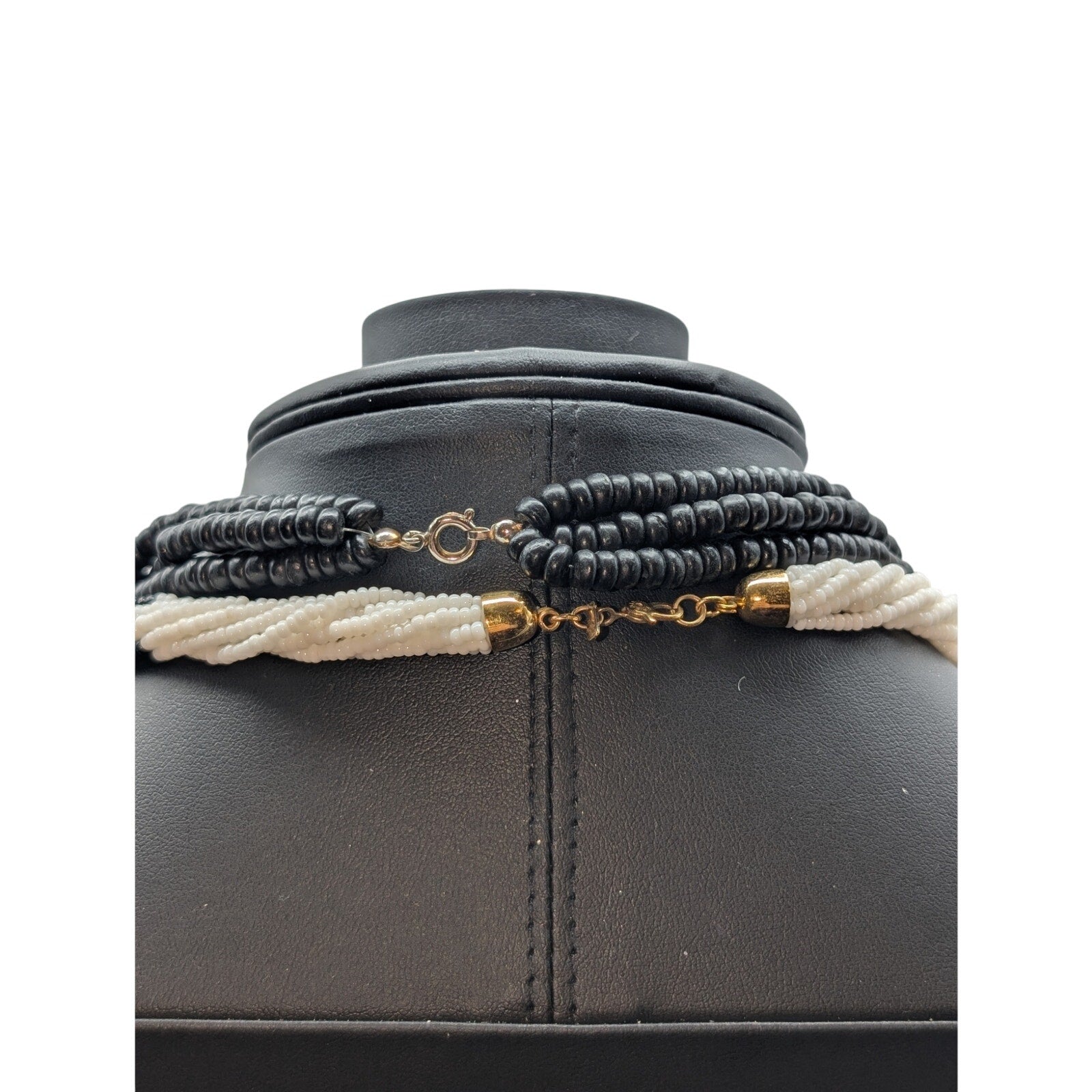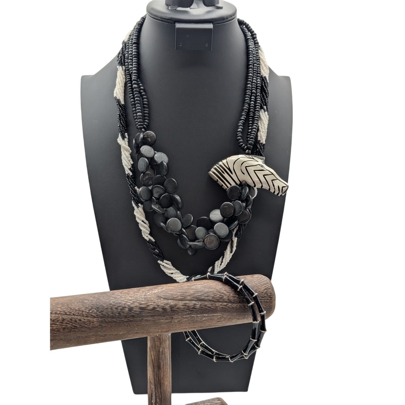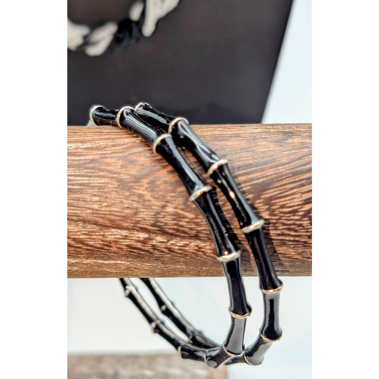 Mixed Lot 2 Black White Bead Necklaces & 2 Black Enamel Bamboo Bangle Bracelets. This lot of two black and white necklaces and two enamel bamboo bangle bracelets is in various conditions (good to excellent). The items chosen for my lots are items I previously had set aside to sell but decided to lot up due to a high volume of inventory. Because they are lotted up and at a reduced price, I have not taken the time to clean them. The multi-strand white and black beaded necklace is Monet.