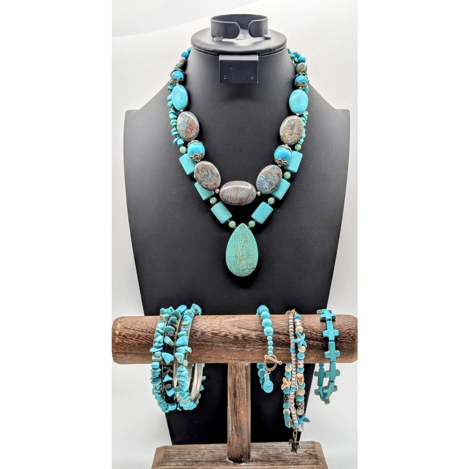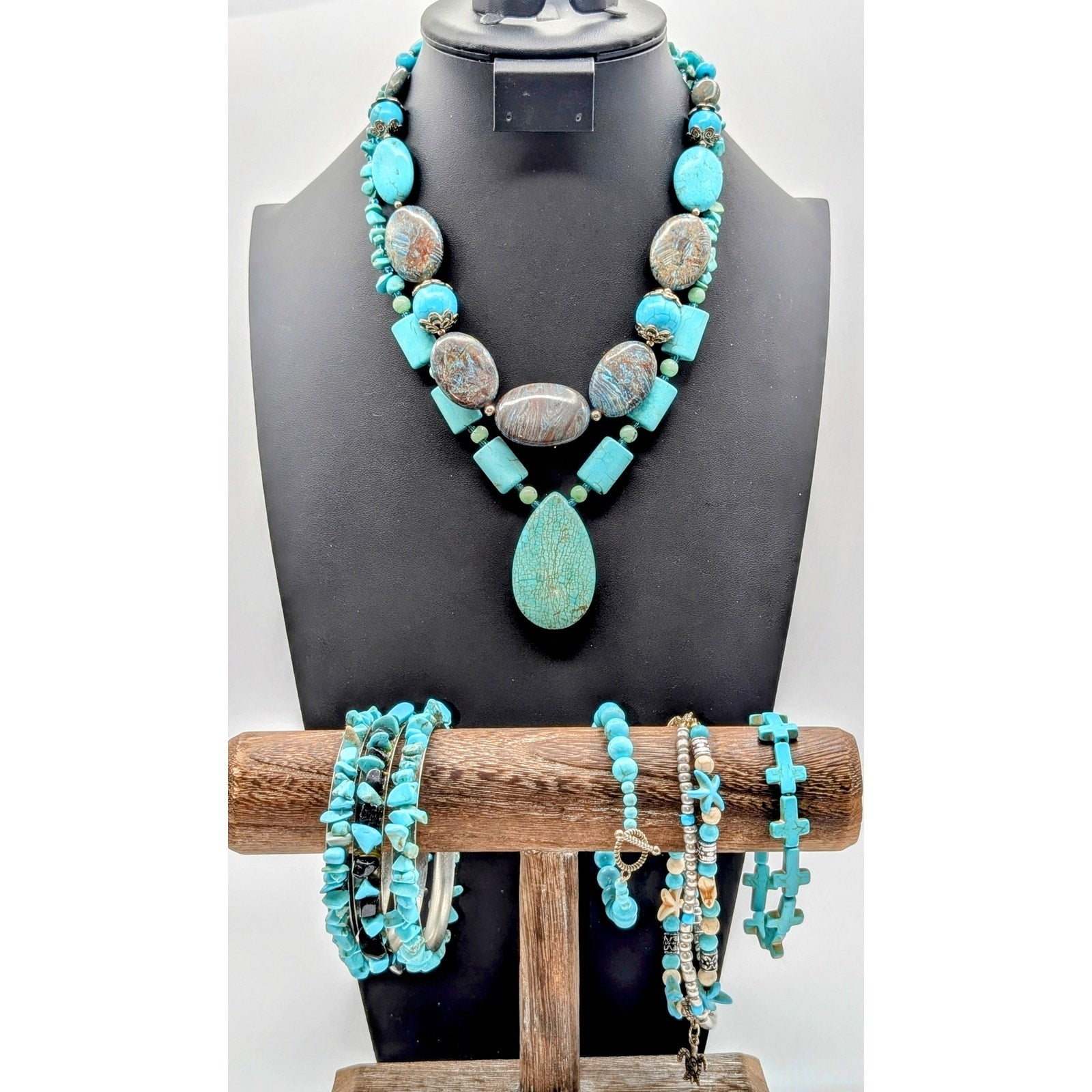 Mixed Lot of Two Blue Stone Necklaces and Six Stone Bracelets to Wear Together or Separately. Pre-owned, this mixed lot of jewelry is in various conditions (all wearable to excellent condition) and being sold as is. The items chosen for my lots are items I previously had set aside to sell but decided to lot up due to a high volume of inventory. Because they are lotted up and at a reduced price, I have not taken the time to clean them.