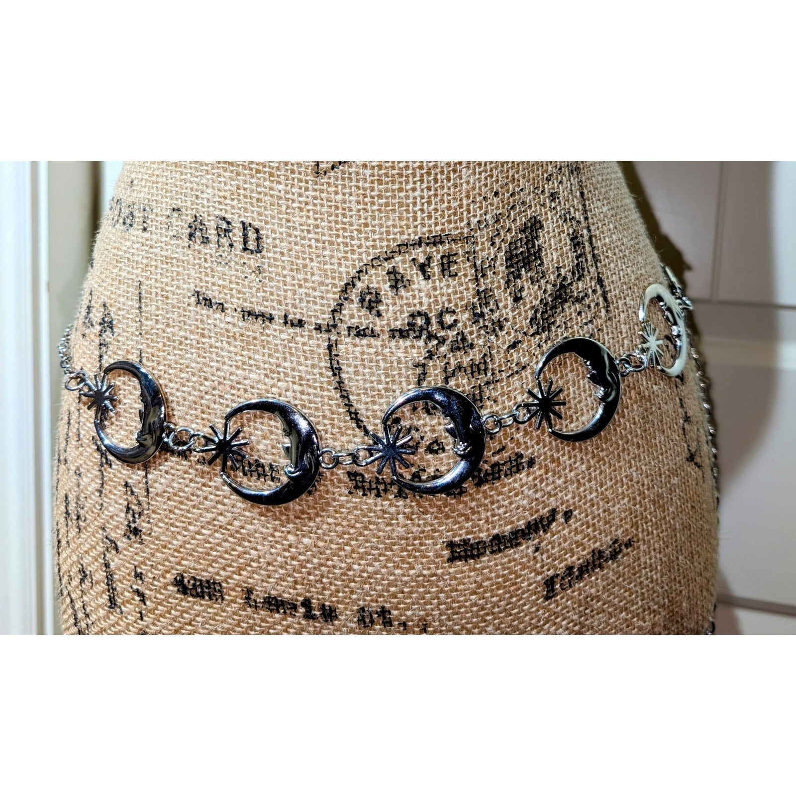 Moon Sun Boho Retro Punk Silver Tone Metal 43" or Less Waist Chain Belt. Pre-owned, this belt is in excellent condition. Depending upon how much drape you want or how much chain dangle you want the highest position to clasp on this belt is 43".