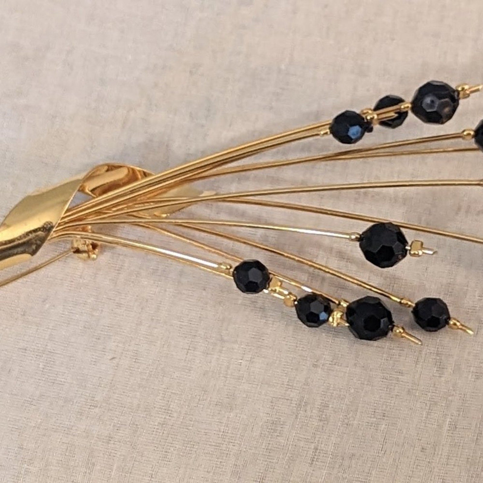 Mourning Jewelry Modernist Vintage Collectible 18k Gold Plated Art Nouveau Brooch. Black faux crystal beads. Pre-owned, this brooch is in great condition. It is a long brooch!