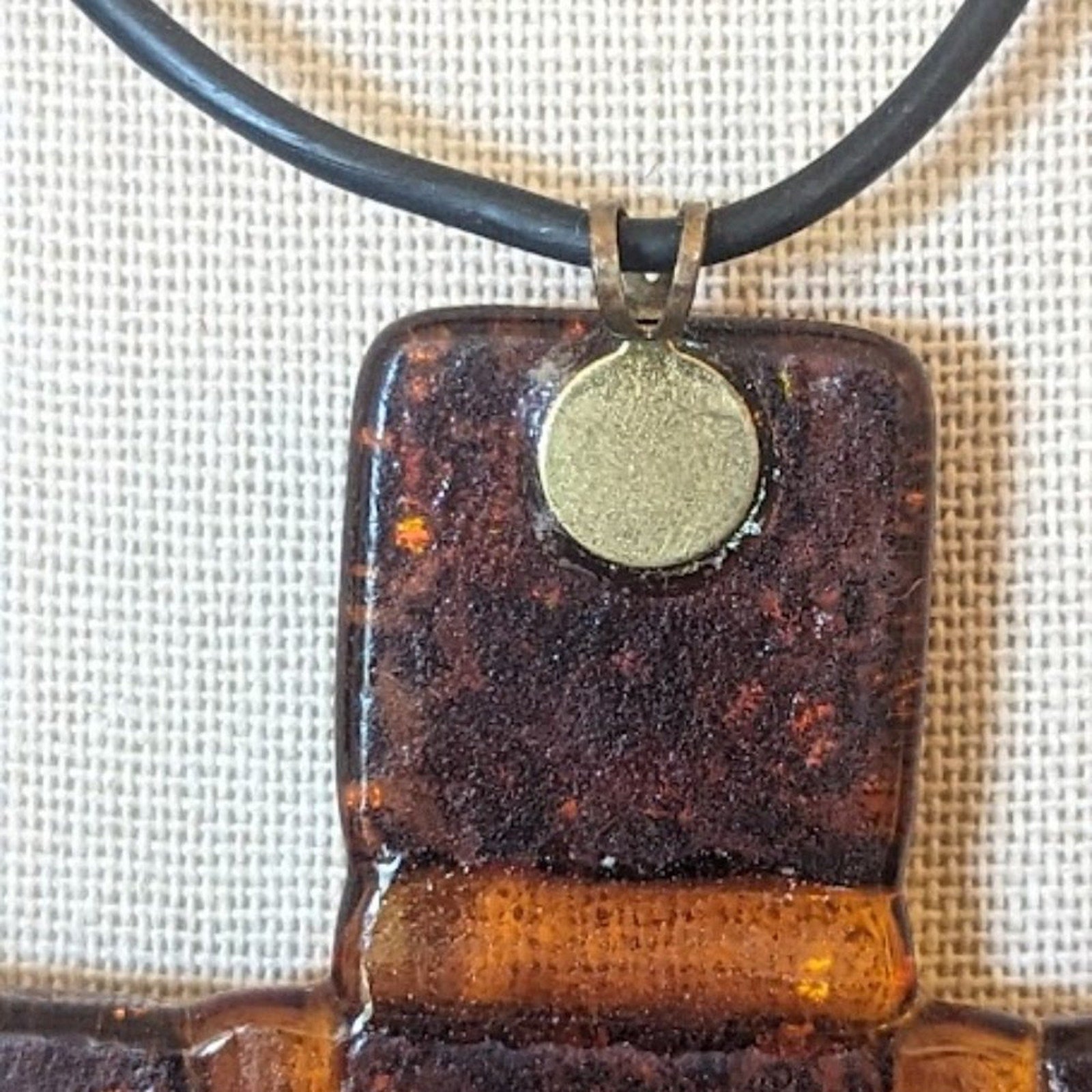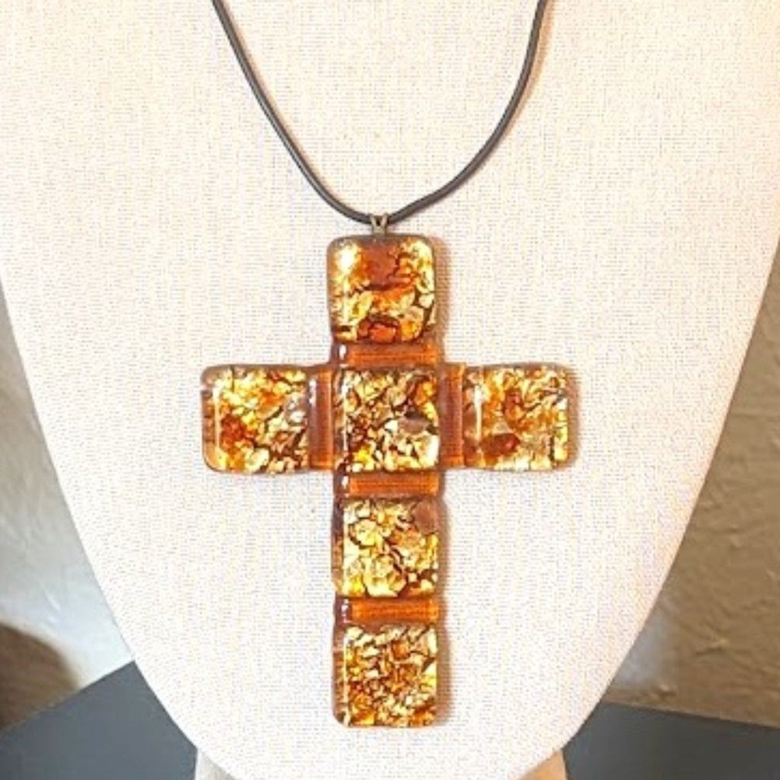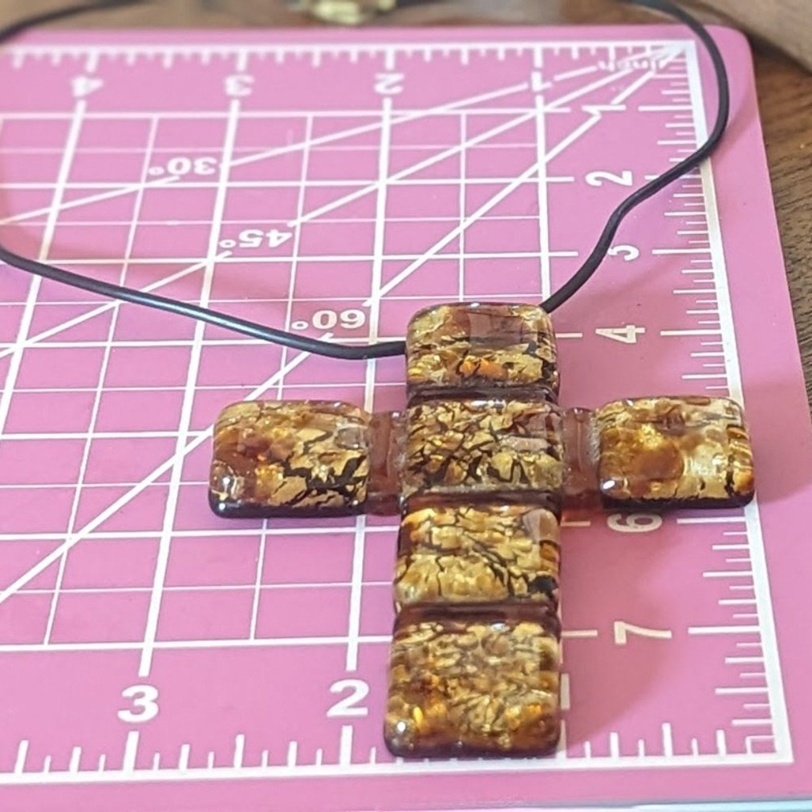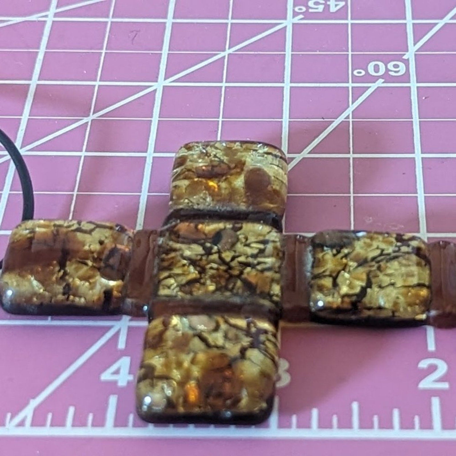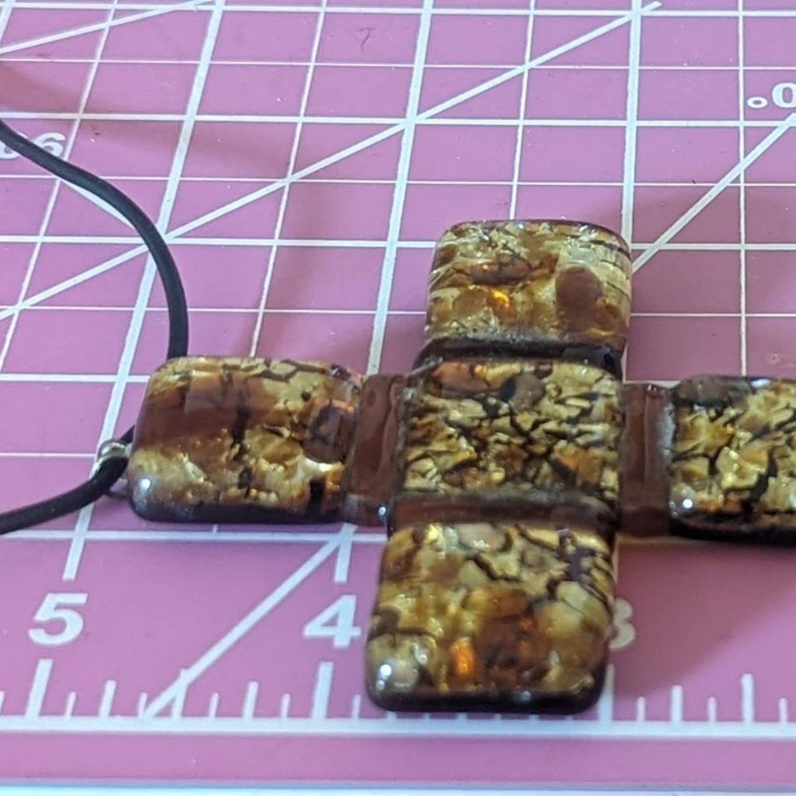 Murano Brown and Gold Segmented Glass Cross -- Signed Vetro Artistico 070 with Artist's Signature Vetreria Accaeffe. I put this pendant on a black cord with a vintage clasp. You can put it on whatever you would like. There are beautiful colors of caramel, gold, orange and brown in this pendant. Pre-owned, it is in great condition. Measurements can be seen in the photos. It is quite large.