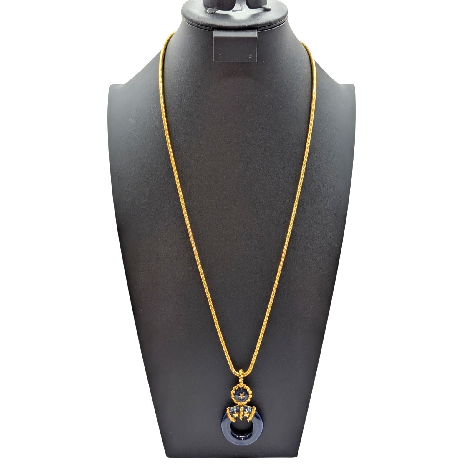 Nautical Navy Enamel Life Preserver Pendant Gold Tone Long Snake Chain Approximately 28" Necklace. Pre-owned, this necklace is in excellent condition.