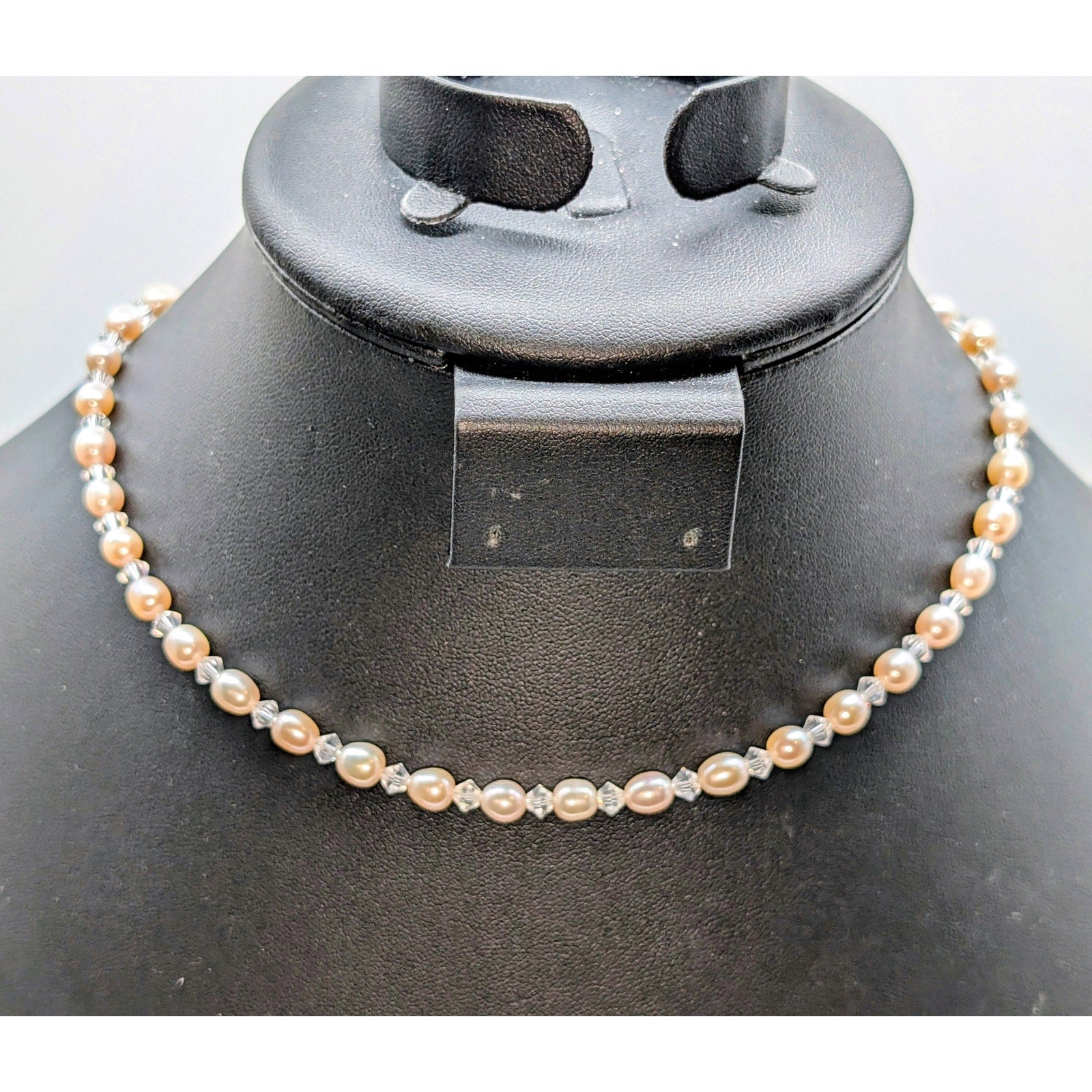 Pale Pink Freshwater Pearl (Approx 6mm) Clear Bicone Crystal Beaded 925 Sterling Silver Necklace measuring 15.75"-17.75" long. Pre-owned, this necklace is in excellent condition. I have not cleaned the sterling chain portions. I will leave that up to the buyer. Sweet necklace for a young lady who is feminine.