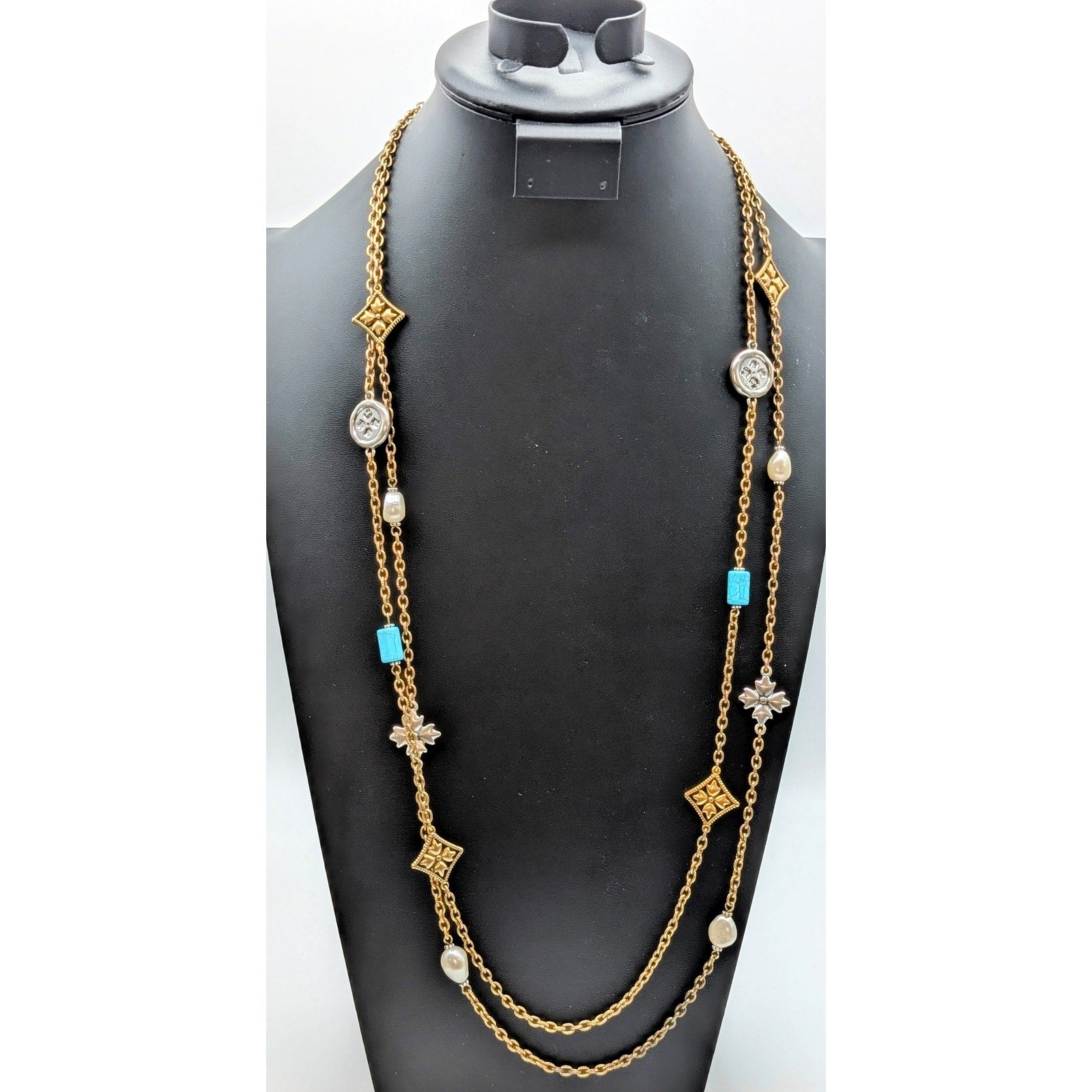 Patricia Nash Two Strand Antique Gold/Bronze Chain Two Tone Beaded Necklace. Shortest chain is approximately 32" long. Silver tone, bronze tone Nash symbol stations, faux pearls and bright blue beads. Pre-owned, this necklace is in excellent condition. Sailor or mariner's clasp with Nash dangle at neck.