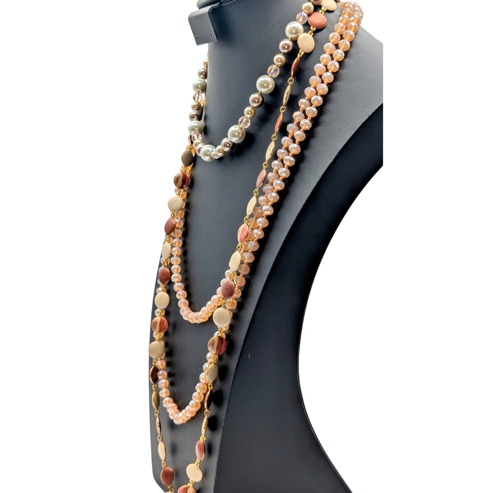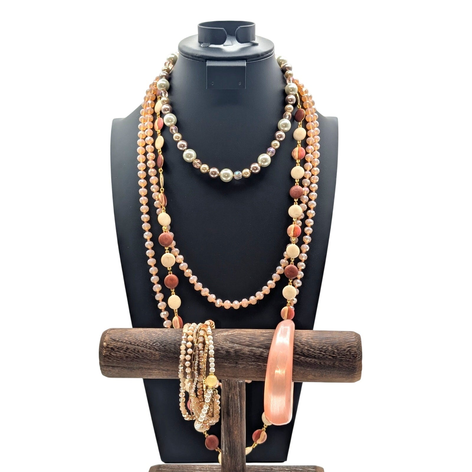 Peachy Pink Lot of VTG to Modern Mixed Jewelry Lot of 3 Necklaces & 2 Bracelets. Faux pearls, crystals vintage beaded strand, Czech glass beads, multi-strand bracelet and lucite bangle. Pre-owned, this mixed lot of jewelry is in various conditions and being sold as is. The items chosen for my lots are items I previously had set aside to sell but decided to lot up due to a high volume of inventory. All wearable to excellent. Because they are lotted up and at a reduced price, I have not taken the time to clean them.