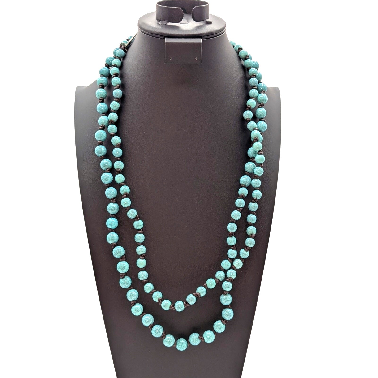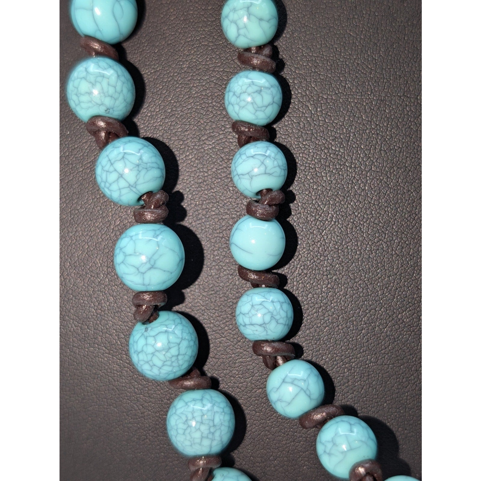 Plunder Design Faux Turquoise Acrylic Bead Knotted Cord Long Strand 60" Necklace. Pre-owned, this necklace is in excellent condition. Great for layering.