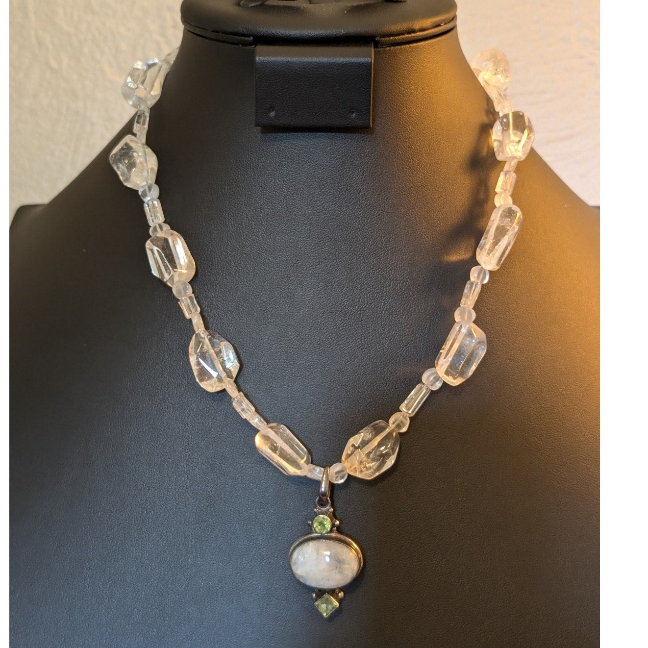 Polished Rock Quartz 925 Sterling Silver W/ Peridot Moonstone Pendant Necklace