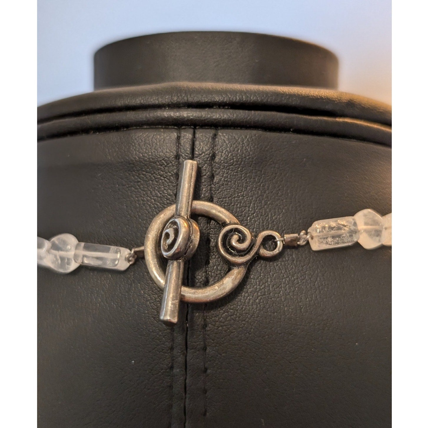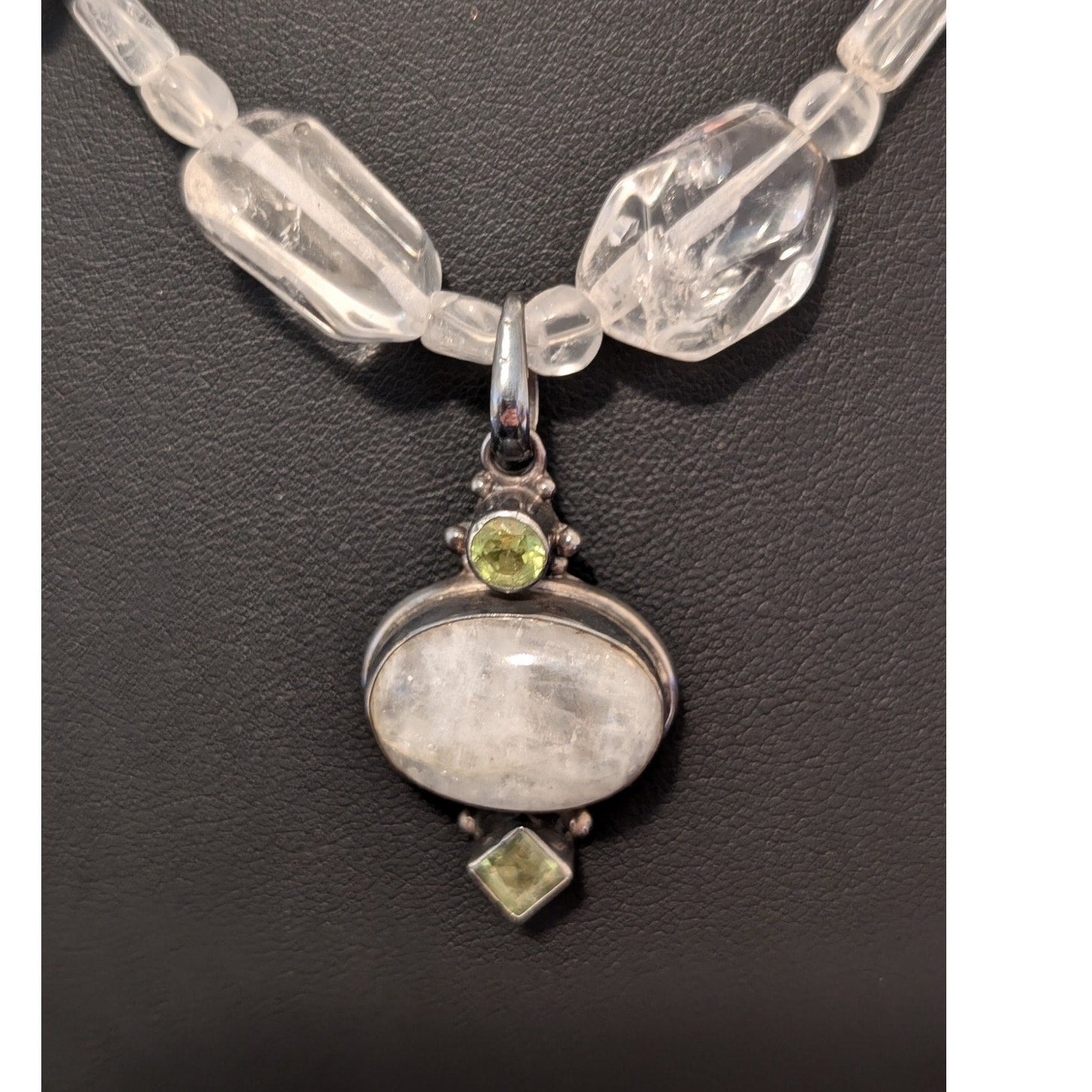 Chunky Polished Rock Quartz 925 Sterling Silver W/ Peridot Moonstone Pendant Necklace. Pre-owned, this necklace is in excellent condition. Decorative Toggle Clasp. Pendant measures 1-5/8" long and necklace measures 19" long.