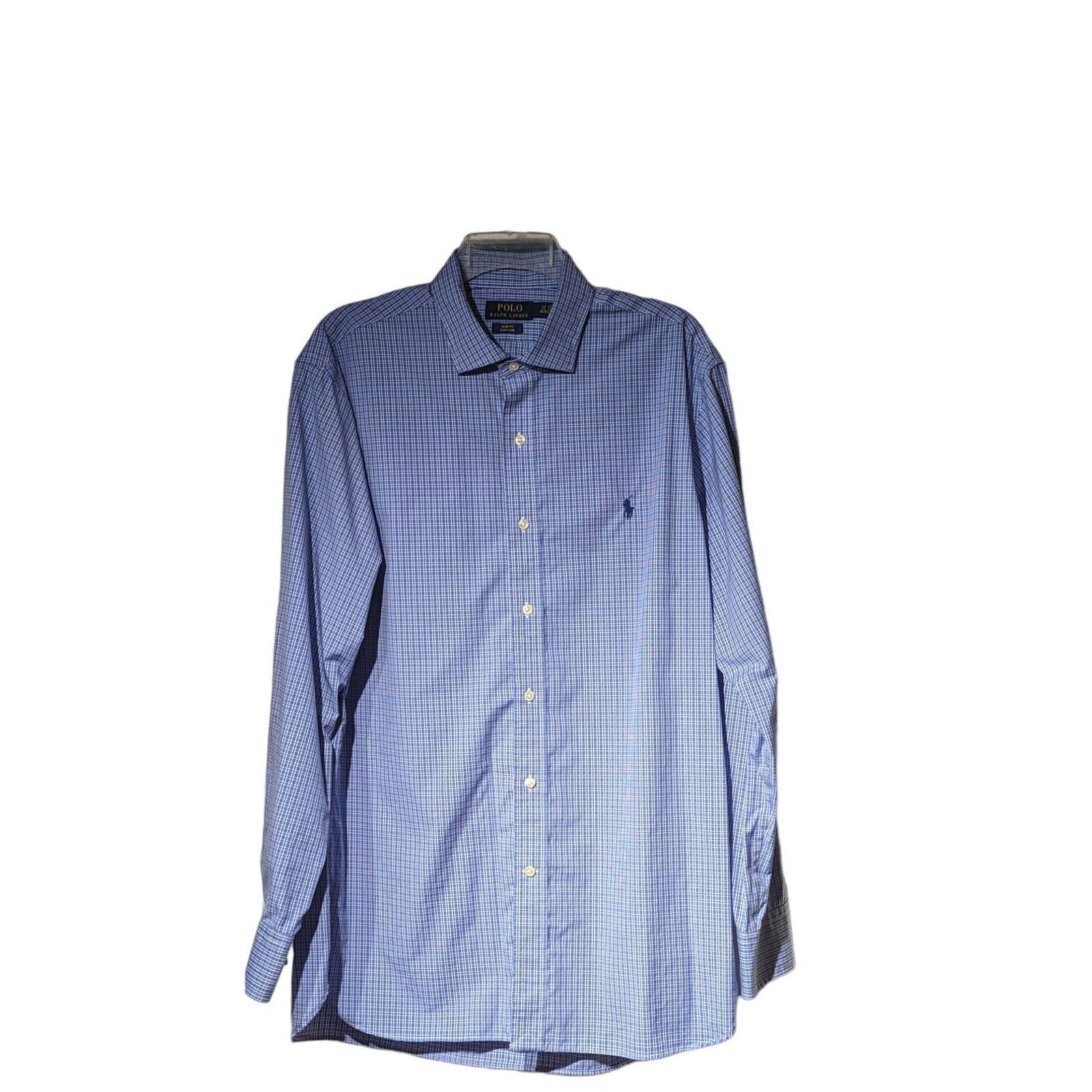Polo Ralph Lauren Men's Blue Plaid Slim Fit Easy Care Dress Shirt Sz 17-34/35. Pre-owned, this shirt is in excellent condition. 100% Cotton. Measures 32" long.